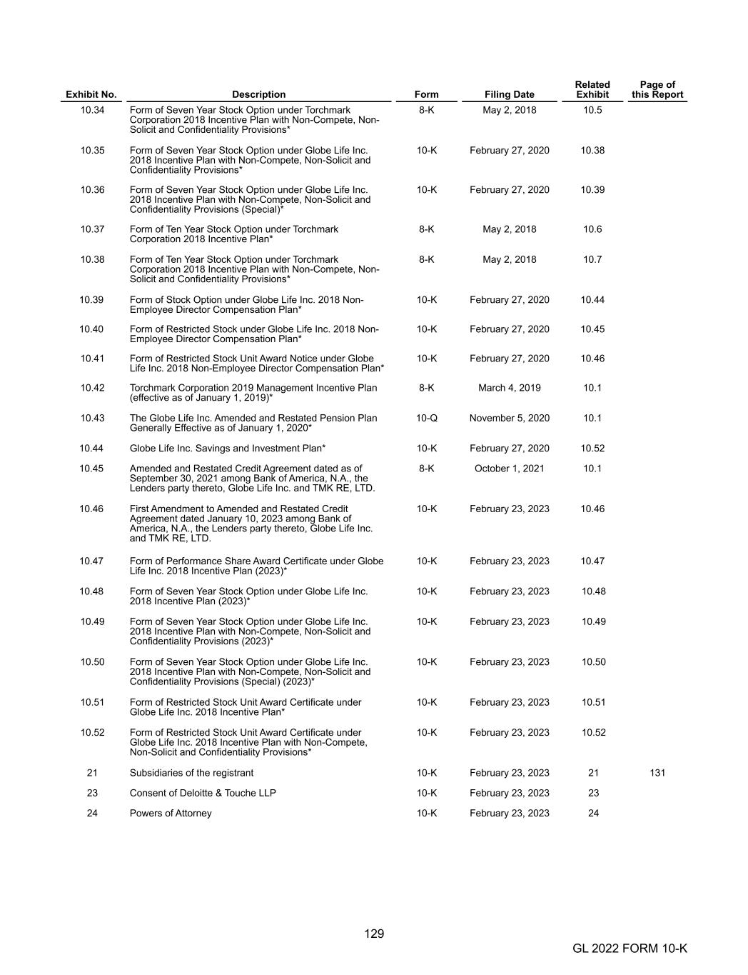 10.34 Form of Seven Year Stock Option under Torchmark Corporation 2018 Incentive Plan with Non-Compete, Non- Solicit and Confidentiality Provisions* 8-K May 2, 2018 10.5 10.35 Form of Seven Year Stock Option under Globe Life Inc. 2018 Incentive Plan with Non-Compete, Non-Solicit and Confidentiality Provisions* 10-K February 27, 2020 10.38 10.36 Form of Seven Year Stock Option under Globe Life Inc. 2018 Incentive Plan with Non-Compete, Non-Solicit and Confidentiality Provisions (Special)* 10-K February 27, 2020 10.39 10.37 Form of Ten Year Stock Option under Torchmark Corporation 2018 Incentive Plan* 8-K May 2, 2018 10.6 10.38 Form of Ten Year Stock Option under Torchmark Corporation 2018 Incentive Plan with Non-Compete, Non- Solicit and Confidentiality Provisions* 8-K May 2, 2018 10.7 10.39 Form of Stock Option under Globe Life Inc. 2018 Non- Employee Director Compensation Plan* 10-K February 27, 2020 10.44 10.40 Form of Restricted Stock under Globe Life Inc. 2018 Non- Employee Director Compensation Plan* 10-K February 27, 2020 10.45 10.41 Form of Restricted Stock Unit Award Notice under Globe Life Inc. 2018 Non-Employee Director Compensation Plan* 10-K February 27, 2020 10.46 10.42 Torchmark Corporation 2019 Management Incentive Plan (effective as of January 1, 2019)* 8-K March 4, 2019 10.1 10.43 The Globe Life Inc. Amended and Restated Pension Plan Generally Effective as of January 1, 2020* 10-Q November 5, 2020 10.1 10.44 Globe Life Inc. Savings and Investment Plan* 10-K February 27, 2020 10.52 10.45 Amended and Restated Credit Agreement dated as of September 30, 2021 among Bank of America, N.A., the Lenders party thereto, Globe Life Inc. and TMK RE, LTD. 8-K October 1, 2021 10.1 10.46 First Amendment to Amended and Restated Credit Agreement dated January 10, 2023 among Bank of America, N.A., the Lenders party thereto, Globe Life Inc. and TMK RE, LTD. 10-K February 23, 2023 10.46 10.47 Form of Performance Share Award Certificate under Globe Life Inc. 2018 Incentive Plan (2023)* 10-K February 23, 2023 10.47 10.48 Form of Seven Year Stock Option under Globe Life Inc. 2018 Incentive Plan (2023)* 10-K February 23, 2023 10.48 10.49 Form of Seven Year Stock Option under Globe Life Inc. 2018 Incentive Plan with Non-Compete, Non-Solicit and Confidentiality Provisions (2023)* 10-K February 23, 2023 10.49 10.50 Form of Seven Year Stock Option under Globe Life Inc. 2018 Incentive Plan with Non-Compete, Non-Solicit and Confidentiality Provisions (Special) (2023)* 10-K February 23, 2023 10.50 10.51 Form of Restricted Stock Unit Award Certificate under Globe Life Inc. 2018 Incentive Plan* 10-K February 23, 2023 10.51 10.52 Form of Restricted Stock Unit Award Certificate under Globe Life Inc. 2018 Incentive Plan with Non-Compete, Non-Solicit and Confidentiality Provisions* 10-K February 23, 2023 10.52 21 Subsidiaries of the registrant 10-K February 23, 2023 21 131 23 Consent of Deloitte & Touche LLP 10-K February 23, 2023 23 24 Powers of Attorney 10-K February 23, 2023 24 Exhibit No. Description Form Filing Date Related Exhibit Page of this Report 129 GL 2022 FORM 10-K