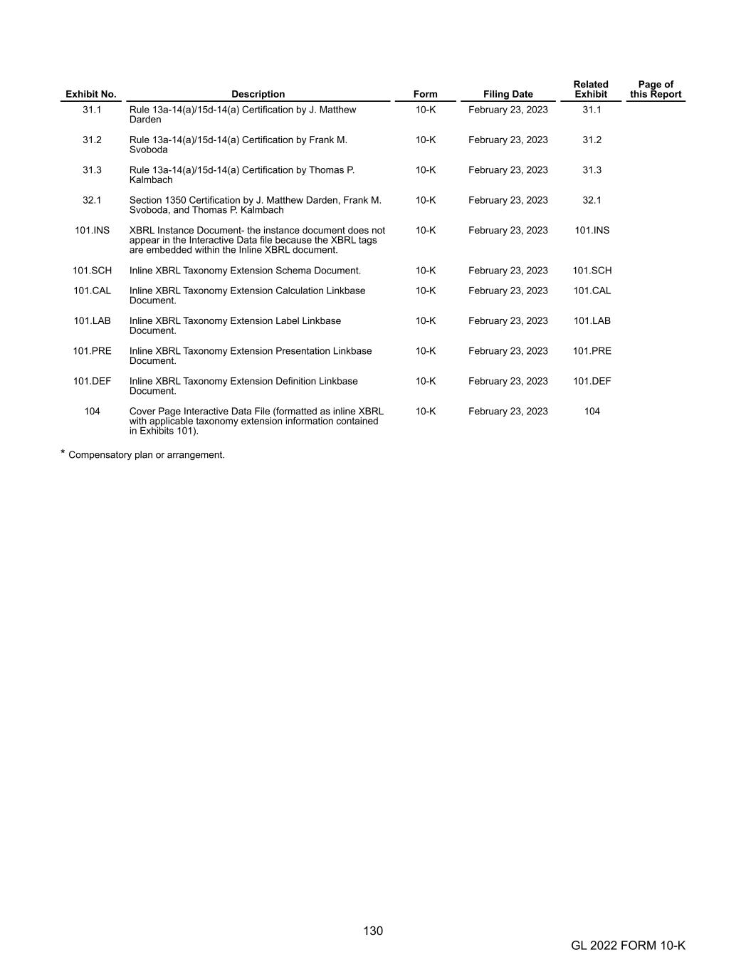 31.1 Rule 13a-14(a)/15d-14(a) Certification by J. Matthew Darden 10-K February 23, 2023 31.1 31.2 Rule 13a-14(a)/15d-14(a) Certification by Frank M. Svoboda 10-K February 23, 2023 31.2 31.3 Rule 13a-14(a)/15d-14(a) Certification by Thomas P. Kalmbach 10-K February 23, 2023 31.3 32.1 Section 1350 Certification by J. Matthew Darden, Frank M. Svoboda, and Thomas P. Kalmbach 10-K February 23, 2023 32.1 101.INS XBRL Instance Document- the instance document does not appear in the Interactive Data file because the XBRL tags are embedded within the Inline XBRL document. 10-K February 23, 2023 101.INS 101.SCH Inline XBRL Taxonomy Extension Schema Document. 10-K February 23, 2023 101.SCH 101.CAL Inline XBRL Taxonomy Extension Calculation Linkbase Document. 10-K February 23, 2023 101.CAL 101.LAB Inline XBRL Taxonomy Extension Label Linkbase Document. 10-K February 23, 2023 101.LAB 101.PRE Inline XBRL Taxonomy Extension Presentation Linkbase Document. 10-K February 23, 2023 101.PRE 101.DEF Inline XBRL Taxonomy Extension Definition Linkbase Document. 10-K February 23, 2023 101.DEF 104 Cover Page Interactive Data File (formatted as inline XBRL with applicable taxonomy extension information contained in Exhibits 101). 10-K February 23, 2023 104 Exhibit No. Description Form Filing Date Related Exhibit Page of this Report * Compensatory plan or arrangement. 130 GL 2022 FORM 10-K