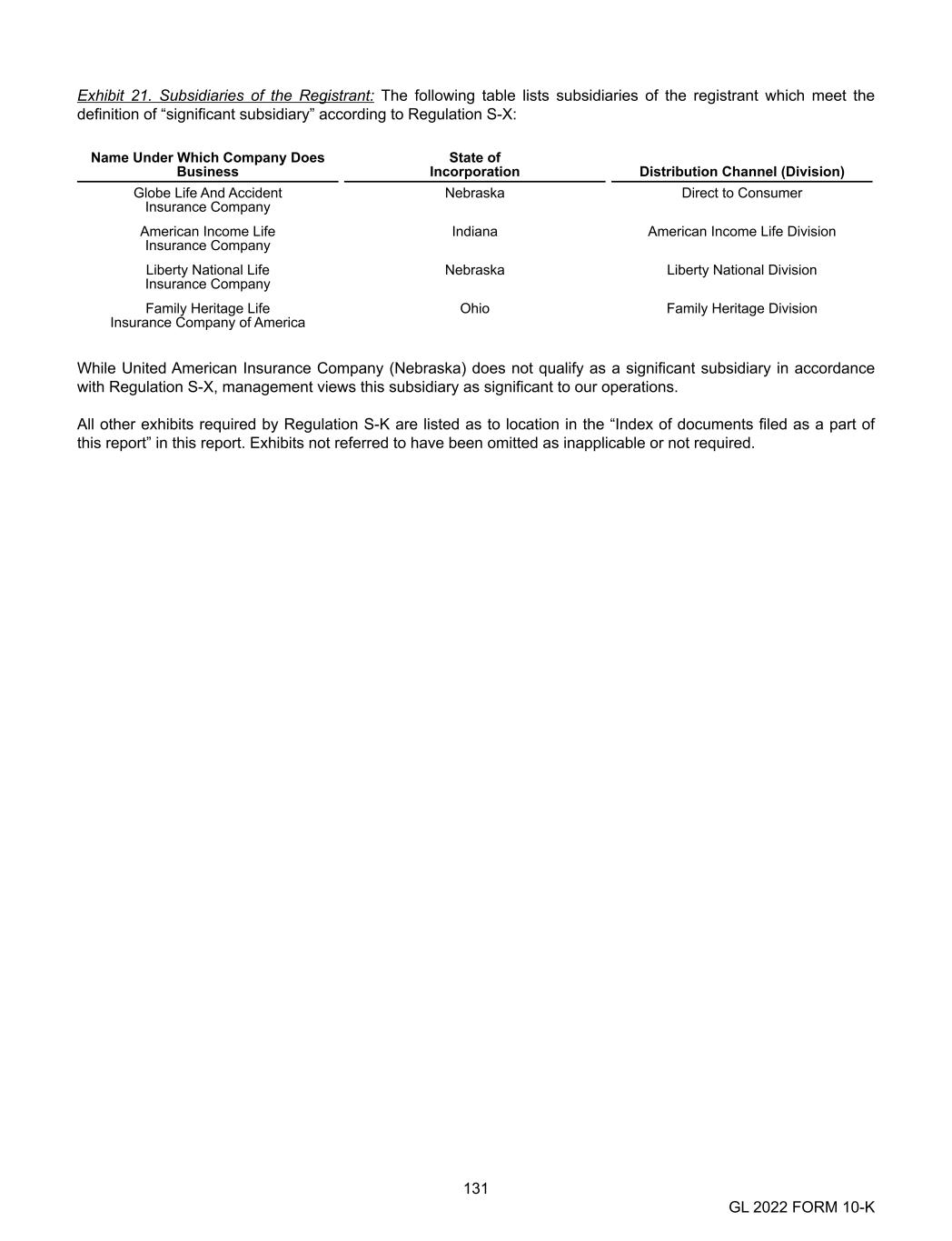Exhibit 21. Subsidiaries of the Registrant: The following table lists subsidiaries of the registrant which meet the definition of “significant subsidiary” according to Regulation S-X: Name Under Which Company Does Business State of Incorporation Distribution Channel (Division) Globe Life And Accident Insurance Company Nebraska Direct to Consumer American Income Life Insurance Company Indiana American Income Life Division Liberty National Life Insurance Company Nebraska Liberty National Division Family Heritage Life Insurance Company of America Ohio Family Heritage Division While United American Insurance Company (Nebraska) does not qualify as a significant subsidiary in accordance with Regulation S-X, management views this subsidiary as significant to our operations. All other exhibits required by Regulation S-K are listed as to location in the “Index of documents filed as a part of this report” in this report. Exhibits not referred to have been omitted as inapplicable or not required. 131 GL 2022 FORM 10-K