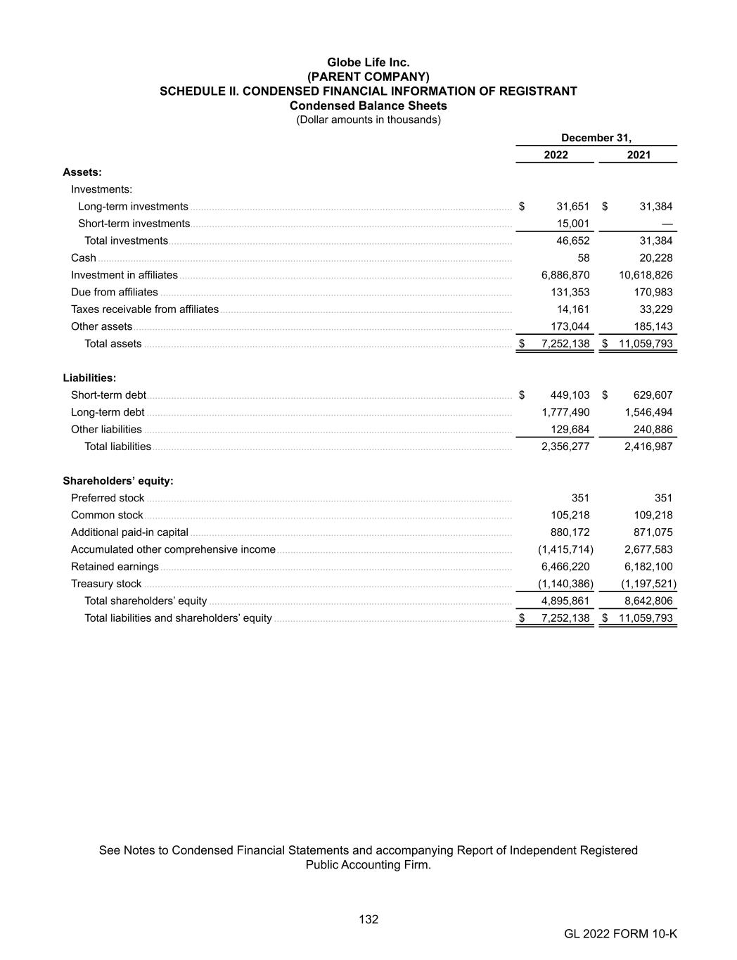 Globe Life Inc. (PARENT COMPANY) SCHEDULE II. CONDENSED FINANCIAL INFORMATION OF REGISTRANT Condensed Balance Sheets (Dollar amounts in thousands) December 31, 2022 2021 Assets: Investments: Long-term investments ....................................................................................................................... $ 31,651 $ 31,384 Short-term investments....................................................................................................................... 15,001 — Total investments............................................................................................................................... 46,652 31,384 Cash ......................................................................................................................................................... 58 20,228 Investment in affiliates ........................................................................................................................... 6,886,870 10,618,826 Due from affiliates .................................................................................................................................. 131,353 170,983 Taxes receivable from affiliates ............................................................................................................ 14,161 33,229 Other assets............................................................................................................................................ 173,044 185,143 Total assets ........................................................................................................................................ $ 7,252,138 $ 11,059,793 Liabilities: Short-term debt....................................................................................................................................... $ 449,103 $ 629,607 Long-term debt ....................................................................................................................................... 1,777,490 1,546,494 Other liabilities ........................................................................................................................................ 129,684 240,886 Total liabilities..................................................................................................................................... 2,356,277 2,416,987 Shareholders’ equity: Preferred stock ....................................................................................................................................... 351 351 Common stock........................................................................................................................................ 105,218 109,218 Additional paid-in capital ....................................................................................................................... 880,172 871,075 Accumulated other comprehensive income ....................................................................................... (1,415,714) 2,677,583 Retained earnings .................................................................................................................................. 6,466,220 6,182,100 Treasury stock ........................................................................................................................................ (1,140,386) (1,197,521) Total shareholders’ equity ................................................................................................................ 4,895,861 8,642,806 Total liabilities and shareholders’ equity ........................................................................................ $ 7,252,138 $ 11,059,793 See Notes to Condensed Financial Statements and accompanying Report of Independent Registered Public Accounting Firm. 132 GL 2022 FORM 10-K