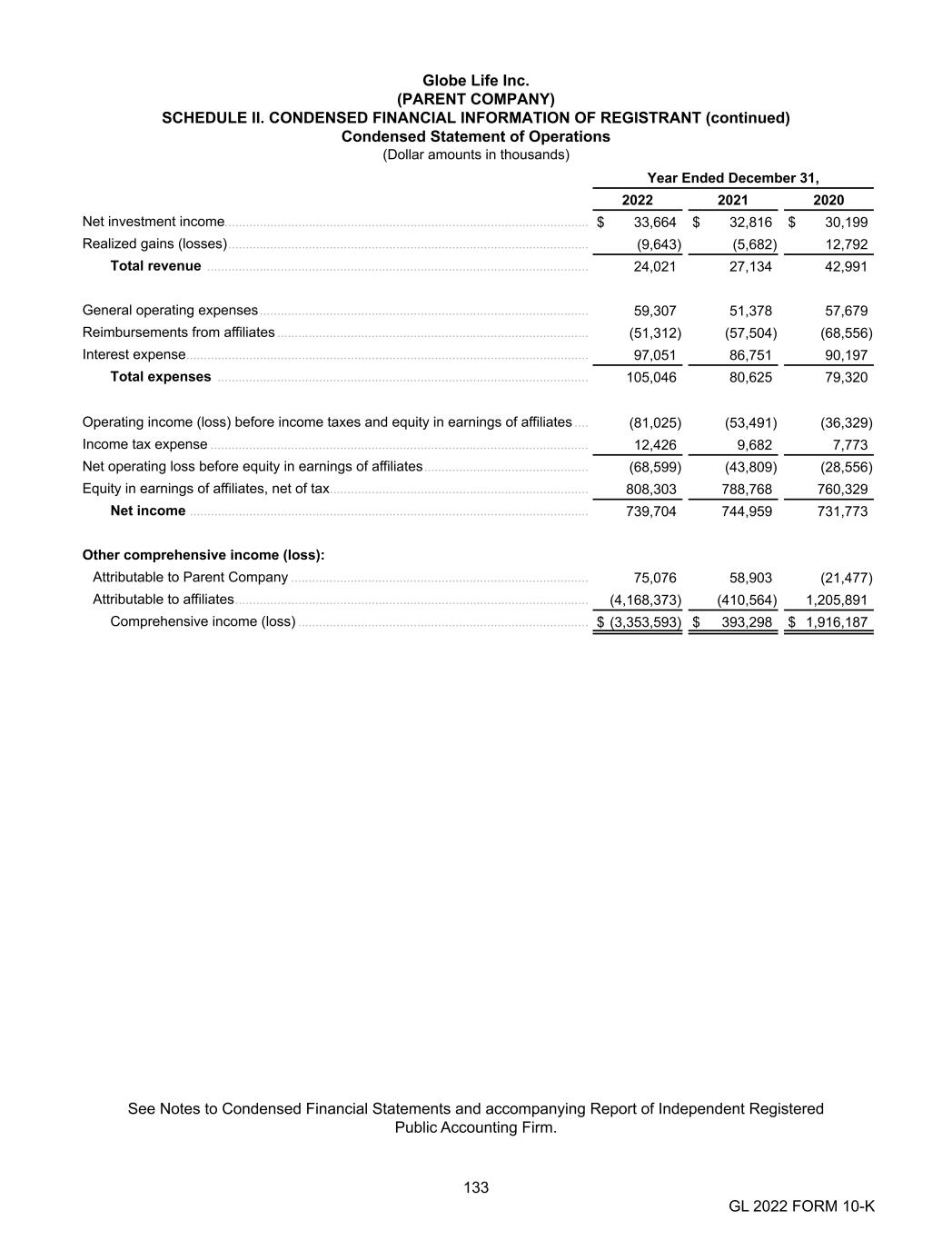 Globe Life Inc. (PARENT COMPANY) SCHEDULE II. CONDENSED FINANCIAL INFORMATION OF REGISTRANT (continued) Condensed Statement of Operations (Dollar amounts in thousands) Year Ended December 31, 2022 2021 2020 Net investment income........................................................................................................ $ 33,664 $ 32,816 $ 30,199 Realized gains (losses)....................................................................................................... (9,643) (5,682) 12,792 Total revenue ............................................................................................................. 24,021 27,134 42,991 General operating expenses .............................................................................................. 59,307 51,378 57,679 Reimbursements from affiliates ......................................................................................... (51,312) (57,504) (68,556) Interest expense................................................................................................................... 97,051 86,751 90,197 Total expenses .......................................................................................................... 105,046 80,625 79,320 Operating income (loss) before income taxes and equity in earnings of affiliates .... (81,025) (53,491) (36,329) Income tax expense ............................................................................................................ 12,426 9,682 7,773 Net operating loss before equity in earnings of affiliates ............................................... (68,599) (43,809) (28,556) Equity in earnings of affiliates, net of tax.......................................................................... 808,303 788,768 760,329 Net income .................................................................................................................. 739,704 744,959 731,773 Other comprehensive income (loss): Attributable to Parent Company ..................................................................................... 75,076 58,903 (21,477) Attributable to affiliates..................................................................................................... (4,168,373) (410,564) 1,205,891 Comprehensive income (loss) ................................................................................... $ (3,353,593) $ 393,298 $ 1,916,187 See Notes to Condensed Financial Statements and accompanying Report of Independent Registered Public Accounting Firm. 133 GL 2022 FORM 10-K