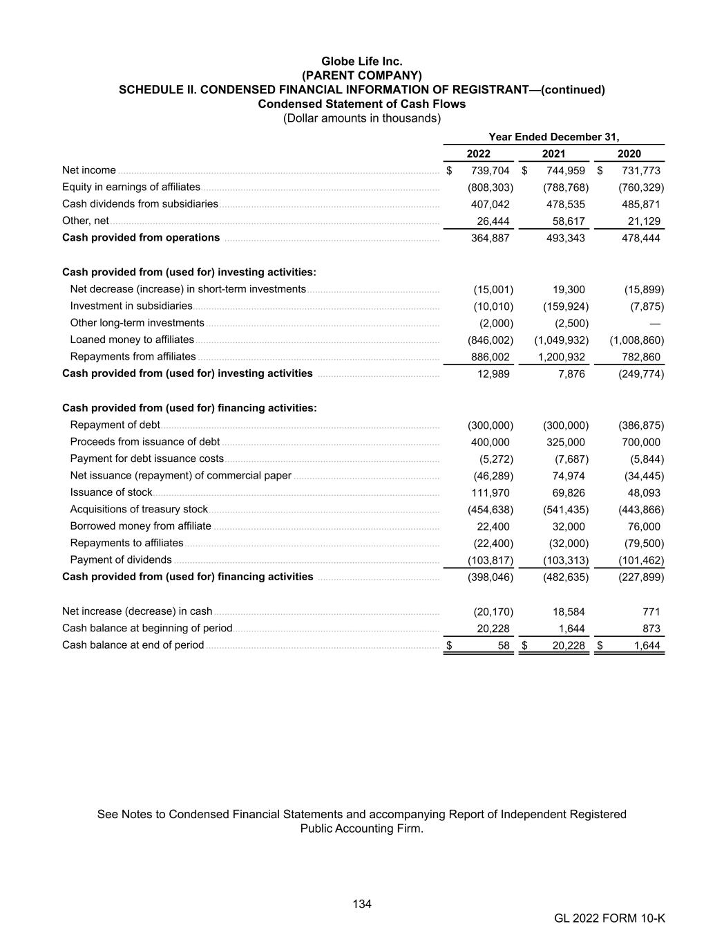 Globe Life Inc. (PARENT COMPANY) SCHEDULE II. CONDENSED FINANCIAL INFORMATION OF REGISTRANT—(continued) Condensed Statement of Cash Flows (Dollar amounts in thousands) Year Ended December 31, 2022 2021 2020 Net income ......................................................................................................................... $ 739,704 $ 744,959 $ 731,773 Equity in earnings of affiliates.......................................................................................... (808,303) (788,768) (760,329) Cash dividends from subsidiaries................................................................................... 407,042 478,535 485,871 Other, net ............................................................................................................................ 26,444 58,617 21,129 Cash provided from operations ................................................................................. 364,887 493,343 478,444 Cash provided from (used for) investing activities: Net decrease (increase) in short-term investments.................................................. (15,001) 19,300 (15,899) Investment in subsidiaries............................................................................................. (10,010) (159,924) (7,875) Other long-term investments ........................................................................................ (2,000) (2,500) — Loaned money to affiliates ............................................................................................ (846,002) (1,049,932) (1,008,860) Repayments from affiliates ........................................................................................... 886,002 1,200,932 782,860 Cash provided from (used for) investing activities .............................................. 12,989 7,876 (249,774) Cash provided from (used for) financing activities: Repayment of debt......................................................................................................... (300,000) (300,000) (386,875) Proceeds from issuance of debt .................................................................................. 400,000 325,000 700,000 Payment for debt issuance costs................................................................................. (5,272) (7,687) (5,844) Net issuance (repayment) of commercial paper ....................................................... (46,289) 74,974 (34,445) Issuance of stock............................................................................................................ 111,970 69,826 48,093 Acquisitions of treasury stock....................................................................................... (454,638) (541,435) (443,866) Borrowed money from affiliate ..................................................................................... 22,400 32,000 76,000 Repayments to affiliates ................................................................................................ (22,400) (32,000) (79,500) Payment of dividends .................................................................................................... (103,817) (103,313) (101,462) Cash provided from (used for) financing activities .............................................. (398,046) (482,635) (227,899) Net increase (decrease) in cash ..................................................................................... (20,170) 18,584 771 Cash balance at beginning of period.............................................................................. 20,228 1,644 873 Cash balance at end of period ........................................................................................ $ 58 $ 20,228 $ 1,644 See Notes to Condensed Financial Statements and accompanying Report of Independent Registered Public Accounting Firm. 134 GL 2022 FORM 10-K