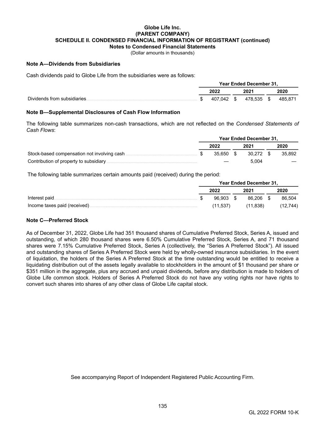 Globe Life Inc. (PARENT COMPANY) SCHEDULE II. CONDENSED FINANCIAL INFORMATION OF REGISTRANT (continued) Notes to Condensed Financial Statements (Dollar amounts in thousands) Note A—Dividends from Subsidiaries Cash dividends paid to Globe Life from the subsidiaries were as follows: Year Ended December 31, 2022 2021 2020 Dividends from subsidiaries............................................................................................. $ 407,042 $ 478,535 $ 485,871 Note B—Supplemental Disclosures of Cash Flow Information The following table summarizes non-cash transactions, which are not reflected on the Condensed Statements of Cash Flows: Year Ended December 31, 2022 2021 2020 Stock-based compensation not involving cash ............................................................ $ 35,650 $ 30,272 $ 35,892 Contribution of property to subsidiary ............................................................................ — 5,004 — The following table summarizes certain amounts paid (received) during the period: Year Ended December 31, 2022 2021 2020 Interest paid........................................................................................................................ $ 96,903 $ 86,206 $ 86,504 Income taxes paid (received) .......................................................................................... (11,537) (11,838) (12,744) Note C—Preferred Stock As of December 31, 2022, Globe Life had 351 thousand shares of Cumulative Preferred Stock, Series A, issued and outstanding, of which 280 thousand shares were 6.50% Cumulative Preferred Stock, Series A, and 71 thousand shares were 7.15% Cumulative Preferred Stock, Series A (collectively, the “Series A Preferred Stock”). All issued and outstanding shares of Series A Preferred Stock were held by wholly-owned insurance subsidiaries. In the event of liquidation, the holders of the Series A Preferred Stock at the time outstanding would be entitled to receive a liquidating distribution out of the assets legally available to stockholders in the amount of $1 thousand per share or $351 million in the aggregate, plus any accrued and unpaid dividends, before any distribution is made to holders of Globe Life common stock. Holders of Series A Preferred Stock do not have any voting rights nor have rights to convert such shares into shares of any other class of Globe Life capital stock. See accompanying Report of Independent Registered Public Accounting Firm. 135 GL 2022 FORM 10-K
