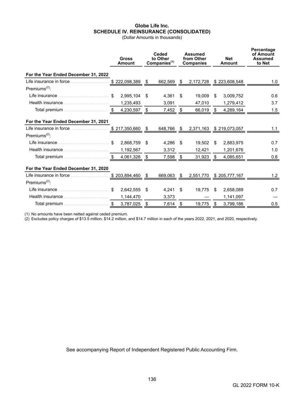Globe Life Inc. SCHEDULE IV. REINSURANCE (CONSOLIDATED) (Dollar Amounts in thousands) Gross Amount Ceded to Other Companies(1) Assumed from Other Companies Net Amount Percentage of Amount Assumed to Net For the Year Ended December 31, 2022 Life insurance in force .................................. $ 222,098,389 $ 662,569 $ 2,172,728 $ 223,608,548 1.0 Premiums(2): Life insurance.............................................. $ 2,995,104 $ 4,361 $ 19,009 $ 3,009,752 0.6 Health insurance......................................... 1,235,493 3,091 47,010 1,279,412 3.7 Total premium ........................................ $ 4,230,597 $ 7,452 $ 66,019 $ 4,289,164 1.5 For the Year Ended December 31, 2021 Life insurance in force .................................. $ 217,350,660 $ 648,766 $ 2,371,163 $ 219,073,057 1.1 Premiums(2): Life insurance.............................................. $ 2,868,759 $ 4,286 $ 19,502 $ 2,883,975 0.7 Health insurance......................................... 1,192,567 3,312 12,421 1,201,676 1.0 Total premium ........................................ $ 4,061,326 $ 7,598 $ 31,923 $ 4,085,651 0.8 For the Year Ended December 31, 2020 Life insurance in force .................................. $ 203,894,460 $ 669,063 $ 2,551,770 $ 205,777,167 1.2 Premiums(2): Life insurance.............................................. $ 2,642,555 $ 4,241 $ 19,775 $ 2,658,089 0.7 Health insurance......................................... 1,144,470 3,373 — 1,141,097 — Total premium ........................................ $ 3,787,025 $ 7,614 $ 19,775 $ 3,799,186 0.5 (1) No amounts have been netted against ceded premium. (2) Excludes policy charges of $13.5 million, $14.2 million, and $14.7 million in each of the years 2022, 2021, and 2020, respectively. See accompanying Report of Independent Registered Public Accounting Firm. 136 GL 2022 FORM 10-K