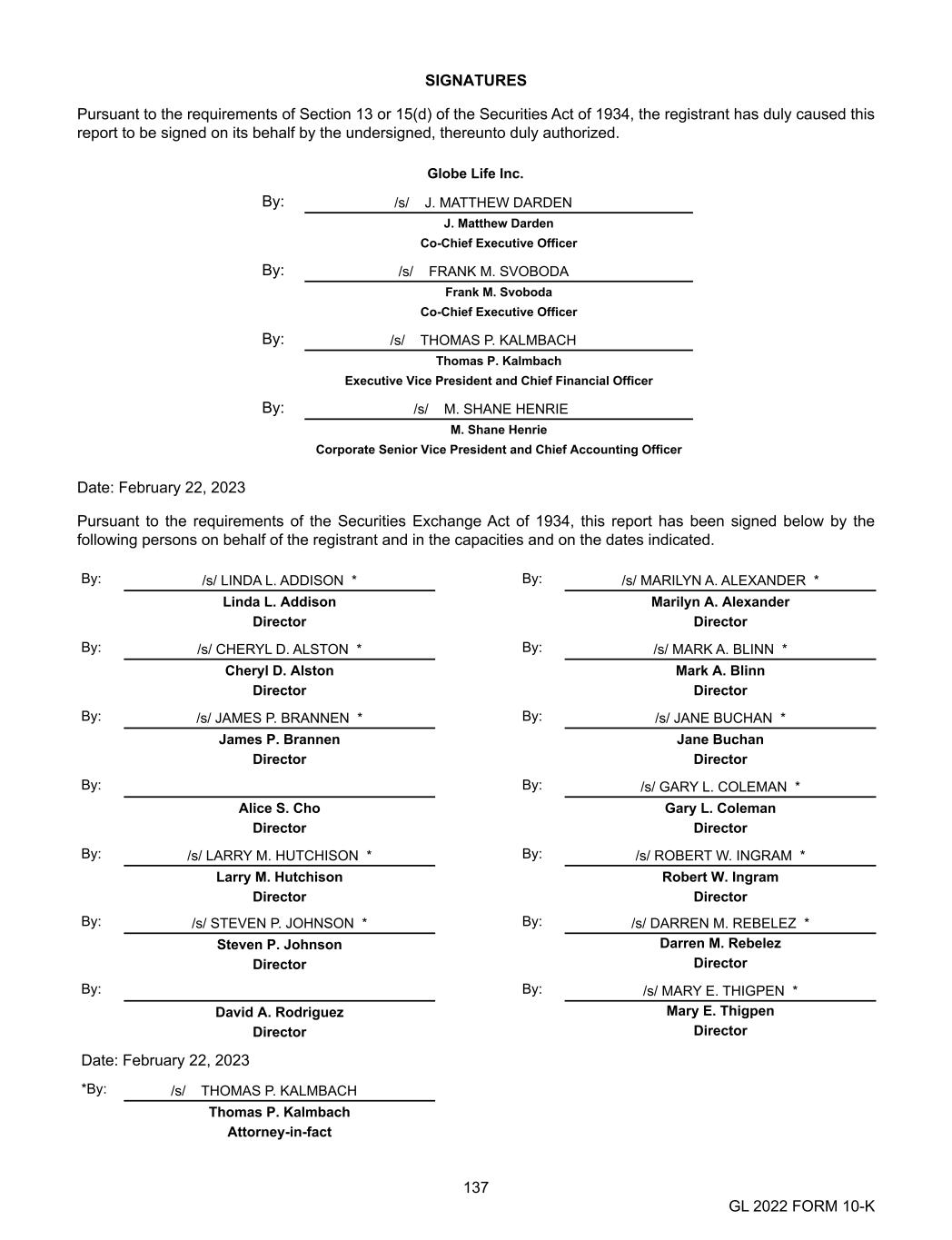 SIGNATURES Pursuant to the requirements of Section 13 or 15(d) of the Securities Act of 1934, the registrant has duly caused this report to be signed on its behalf by the undersigned, thereunto duly authorized. Globe Life Inc. By: /s/ J. MATTHEW DARDEN J. Matthew Darden Co-Chief Executive Officer By: /s/ FRANK M. SVOBODA Frank M. Svoboda Co-Chief Executive Officer By: /s/ THOMAS P. KALMBACH Thomas P. Kalmbach Executive Vice President and Chief Financial Officer By: /s/ M. SHANE HENRIE M. Shane Henrie Corporate Senior Vice President and Chief Accounting Officer Date: February 22, 2023 Pursuant to the requirements of the Securities Exchange Act of 1934, this report has been signed below by the following persons on behalf of the registrant and in the capacities and on the dates indicated. By: /s/ LINDA L. ADDISON * By: /s/ MARILYN A. ALEXANDER * Linda L. Addison Marilyn A. Alexander Director Director By: /s/ CHERYL D. ALSTON * By: /s/ MARK A. BLINN * Cheryl D. Alston Mark A. Blinn Director Director By: /s/ JAMES P. BRANNEN * By: /s/ JANE BUCHAN * James P. Brannen Jane Buchan Director Director By: By: /s/ GARY L. COLEMAN * Alice S. Cho Gary L. Coleman Director Director By: /s/ LARRY M. HUTCHISON * By: /s/ ROBERT W. INGRAM * Larry M. Hutchison Robert W. Ingram Director Director By: /s/ STEVEN P. JOHNSON * By: /s/ DARREN M. REBELEZ * Steven P. Johnson Darren M. Rebelez Director Director By: By: /s/ MARY E. THIGPEN * David A. Rodriguez Mary E. Thigpen Director Director Date: February 22, 2023 *By: /s/ THOMAS P. KALMBACH Thomas P. Kalmbach Attorney-in-fact 137 GL 2022 FORM 10-K