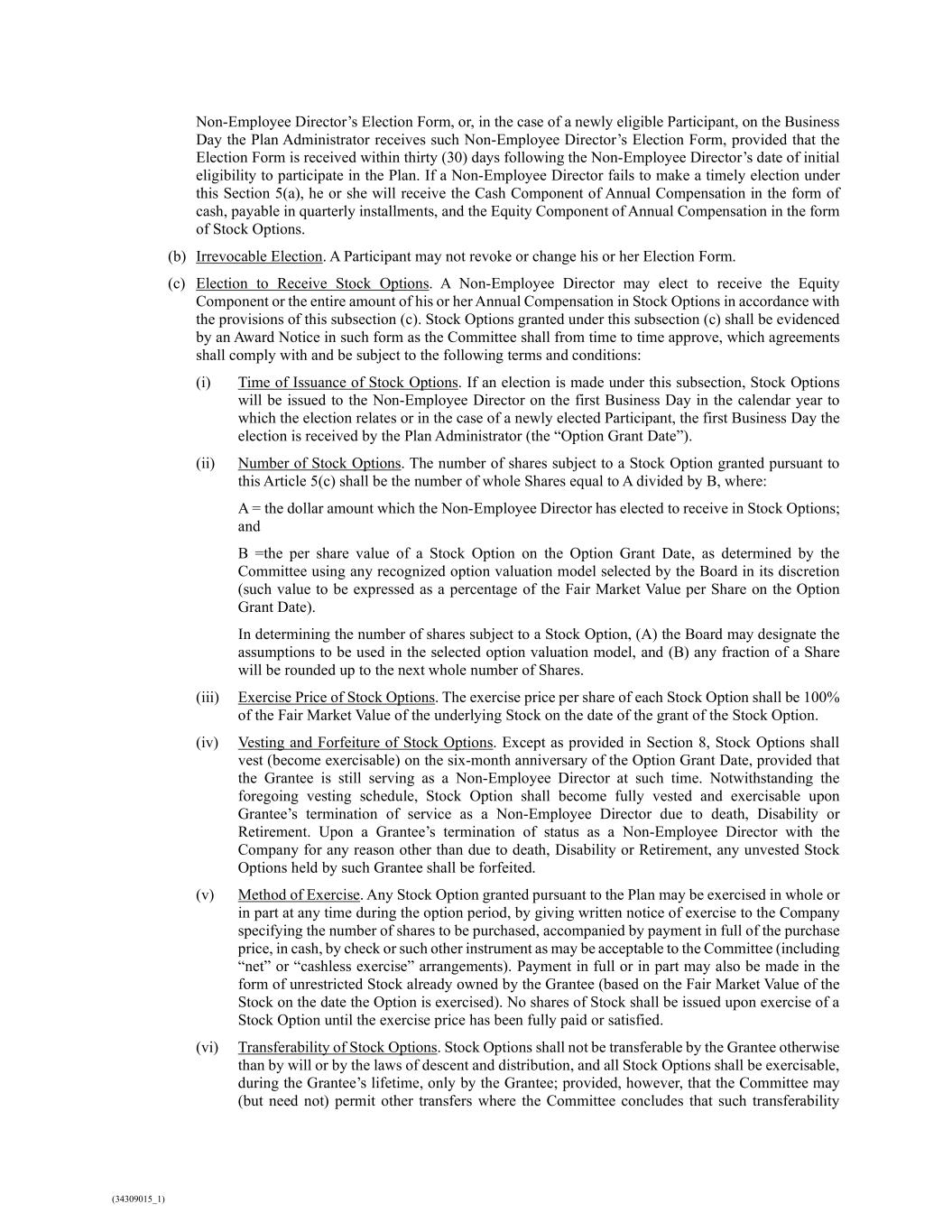 (34309015_1) Non-Employee Director’s Election Form, or, in the case of a newly eligible Participant, on the Business Day the Plan Administrator receives such Non-Employee Director’s Election Form, provided that the Election Form is received within thirty (30) days following the Non-Employee Director’s date of initial eligibility to participate in the Plan. If a Non-Employee Director fails to make a timely election under this Section 5(a), he or she will receive the Cash Component of Annual Compensation in the form of cash, payable in quarterly installments, and the Equity Component of Annual Compensation in the form of Stock Options. (b) Irrevocable Election. A Participant may not revoke or change his or her Election Form. (c) Election to Receive Stock Options. A Non-Employee Director may elect to receive the Equity Component or the entire amount of his or her Annual Compensation in Stock Options in accordance with the provisions of this subsection (c). Stock Options granted under this subsection (c) shall be evidenced by an Award Notice in such form as the Committee shall from time to time approve, which agreements shall comply with and be subject to the following terms and conditions: (i) Time of Issuance of Stock Options. If an election is made under this subsection, Stock Options will be issued to the Non-Employee Director on the first Business Day in the calendar year to which the election relates or in the case of a newly elected Participant, the first Business Day the election is received by the Plan Administrator (the “Option Grant Date”). (ii) Number of Stock Options. The number of shares subject to a Stock Option granted pursuant to this Article 5(c) shall be the number of whole Shares equal to A divided by B, where: A = the dollar amount which the Non-Employee Director has elected to receive in Stock Options; and B =the per share value of a Stock Option on the Option Grant Date, as determined by the Committee using any recognized option valuation model selected by the Board in its discretion (such value to be expressed as a percentage of the Fair Market Value per Share on the Option Grant Date). In determining the number of shares subject to a Stock Option, (A) the Board may designate the assumptions to be used in the selected option valuation model, and (B) any fraction of a Share will be rounded up to the next whole number of Shares. (iii) Exercise Price of Stock Options. The exercise price per share of each Stock Option shall be 100% of the Fair Market Value of the underlying Stock on the date of the grant of the Stock Option. (iv) Vesting and Forfeiture of Stock Options. Except as provided in Section 8, Stock Options shall vest (become exercisable) on the six-month anniversary of the Option Grant Date, provided that the Grantee is still serving as a Non-Employee Director at such time. Notwithstanding the foregoing vesting schedule, Stock Option shall become fully vested and exercisable upon Grantee’s termination of service as a Non-Employee Director due to death, Disability or Retirement. Upon a Grantee’s termination of status as a Non-Employee Director with the Company for any reason other than due to death, Disability or Retirement, any unvested Stock Options held by such Grantee shall be forfeited. (v) Method of Exercise. Any Stock Option granted pursuant to the Plan may be exercised in whole or in part at any time during the option period, by giving written notice of exercise to the Company specifying the number of shares to be purchased, accompanied by payment in full of the purchase price, in cash, by check or such other instrument as may be acceptable to the Committee (including “net” or “cashless exercise” arrangements). Payment in full or in part may also be made in the form of unrestricted Stock already owned by the Grantee (based on the Fair Market Value of the Stock on the date the Option is exercised). No shares of Stock shall be issued upon exercise of a Stock Option until the exercise price has been fully paid or satisfied. (vi) Transferability of Stock Options. Stock Options shall not be transferable by the Grantee otherwise than by will or by the laws of descent and distribution, and all Stock Options shall be exercisable, during the Grantee’s lifetime, only by the Grantee; provided, however, that the Committee may (but need not) permit other transfers where the Committee concludes that such transferability