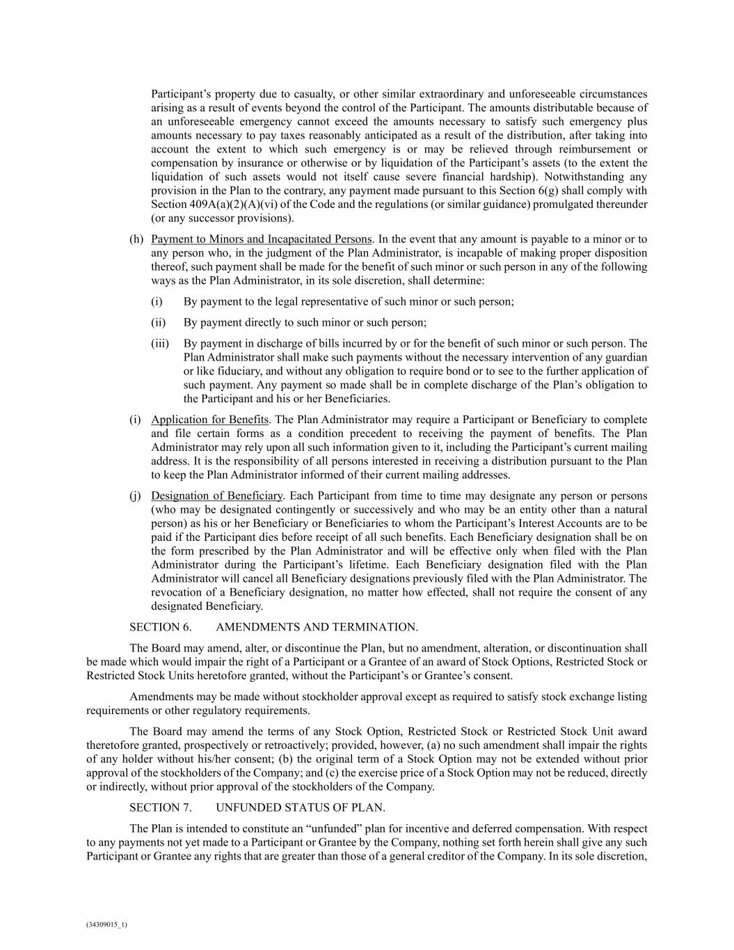 (34309015_1) Participant’s property due to casualty, or other similar extraordinary and unforeseeable circumstances arising as a result of events beyond the control of the Participant. The amounts distributable because of an unforeseeable emergency cannot exceed the amounts necessary to satisfy such emergency plus amounts necessary to pay taxes reasonably anticipated as a result of the distribution, after taking into account the extent to which such emergency is or may be relieved through reimbursement or compensation by insurance or otherwise or by liquidation of the Participant’s assets (to the extent the liquidation of such assets would not itself cause severe financial hardship). Notwithstanding any provision in the Plan to the contrary, any payment made pursuant to this Section 6(g) shall comply with Section 409A(a)(2)(A)(vi) of the Code and the regulations (or similar guidance) promulgated thereunder (or any successor provisions). (h) Payment to Minors and Incapacitated Persons. In the event that any amount is payable to a minor or to any person who, in the judgment of the Plan Administrator, is incapable of making proper disposition thereof, such payment shall be made for the benefit of such minor or such person in any of the following ways as the Plan Administrator, in its sole discretion, shall determine: (i) By payment to the legal representative of such minor or such person; (ii) By payment directly to such minor or such person; (iii) By payment in discharge of bills incurred by or for the benefit of such minor or such person. The Plan Administrator shall make such payments without the necessary intervention of any guardian or like fiduciary, and without any obligation to require bond or to see to the further application of such payment. Any payment so made shall be in complete discharge of the Plan’s obligation to the Participant and his or her Beneficiaries. (i) Application for Benefits. The Plan Administrator may require a Participant or Beneficiary to complete and file certain forms as a condition precedent to receiving the payment of benefits. The Plan Administrator may rely upon all such information given to it, including the Participant’s current mailing address. It is the responsibility of all persons interested in receiving a distribution pursuant to the Plan to keep the Plan Administrator informed of their current mailing addresses. (j) Designation of Beneficiary. Each Participant from time to time may designate any person or persons (who may be designated contingently or successively and who may be an entity other than a natural person) as his or her Beneficiary or Beneficiaries to whom the Participant’s Interest Accounts are to be paid if the Participant dies before receipt of all such benefits. Each Beneficiary designation shall be on the form prescribed by the Plan Administrator and will be effective only when filed with the Plan Administrator during the Participant’s lifetime. Each Beneficiary designation filed with the Plan Administrator will cancel all Beneficiary designations previously filed with the Plan Administrator. The revocation of a Beneficiary designation, no matter how effected, shall not require the consent of any designated Beneficiary. SECTION 6. AMENDMENTS AND TERMINATION. The Board may amend, alter, or discontinue the Plan, but no amendment, alteration, or discontinuation shall be made which would impair the right of a Participant or a Grantee of an award of Stock Options, Restricted Stock or Restricted Stock Units heretofore granted, without the Participant’s or Grantee’s consent. Amendments may be made without stockholder approval except as required to satisfy stock exchange listing requirements or other regulatory requirements. The Board may amend the terms of any Stock Option, Restricted Stock or Restricted Stock Unit award theretofore granted, prospectively or retroactively; provided, however, (a) no such amendment shall impair the rights of any holder without his/her consent; (b) the original term of a Stock Option may not be extended without prior approval of the stockholders of the Company; and (c) the exercise price of a Stock Option may not be reduced, directly or indirectly, without prior approval of the stockholders of the Company. SECTION 7. UNFUNDED STATUS OF PLAN. The Plan is intended to constitute an “unfunded” plan for incentive and deferred compensation. With respect to any payments not yet made to a Participant or Grantee by the Company, nothing set forth herein shall give any such Participant or Grantee any rights that are greater than those of a general creditor of the Company. In its sole discretion,