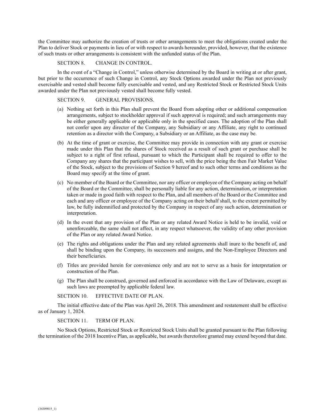 (34309015_1) the Committee may authorize the creation of trusts or other arrangements to meet the obligations created under the Plan to deliver Stock or payments in lieu of or with respect to awards hereunder, provided, however, that the existence of such trusts or other arrangements is consistent with the unfunded status of the Plan. SECTION 8. CHANGE IN CONTROL. In the event of a “Change in Control,” unless otherwise determined by the Board in writing at or after grant, but prior to the occurrence of such Change in Control, any Stock Options awarded under the Plan not previously exercisable and vested shall become fully exercisable and vested, and any Restricted Stock or Restricted Stock Units awarded under the Plan not previously vested shall become fully vested. SECTION 9. GENERAL PROVISIONS. (a) Nothing set forth in this Plan shall prevent the Board from adopting other or additional compensation arrangements, subject to stockholder approval if such approval is required; and such arrangements may be either generally applicable or applicable only in the specified cases. The adoption of the Plan shall not confer upon any director of the Company, any Subsidiary or any Affiliate, any right to continued retention as a director with the Company, a Subsidiary or an Affiliate, as the case may be. (b) At the time of grant or exercise, the Committee may provide in connection with any grant or exercise made under this Plan that the shares of Stock received as a result of such grant or purchase shall be subject to a right of first refusal, pursuant to which the Participant shall be required to offer to the Company any shares that the participant wishes to sell, with the price being the then Fair Market Value of the Stock, subject to the provisions of Section 9 hereof and to such other terms and conditions as the Board may specify at the time of grant. (c) No member of the Board or the Committee, nor any officer or employee of the Company acting on behalf of the Board or the Committee, shall be personally liable for any action, determination, or interpretation taken or made in good faith with respect to the Plan, and all members of the Board or the Committee and each and any officer or employee of the Company acting on their behalf shall, to the extent permitted by law, be fully indemnified and protected by the Company in respect of any such action, determination or interpretation. (d) In the event that any provision of the Plan or any related Award Notice is held to be invalid, void or unenforceable, the same shall not affect, in any respect whatsoever, the validity of any other provision of the Plan or any related Award Notice. (e) The rights and obligations under the Plan and any related agreements shall inure to the benefit of, and shall be binding upon the Company, its successors and assigns, and the Non-Employee Directors and their beneficiaries. (f) Titles are provided herein for convenience only and are not to serve as a basis for interpretation or construction of the Plan. (g) The Plan shall be construed, governed and enforced in accordance with the Law of Delaware, except as such laws are preempted by applicable federal law. SECTION 10. EFFECTIVE DATE OF PLAN. The initial effective date of the Plan was April 26, 2018. This amendment and restatement shall be effective as of January 1, 2024. SECTION 11. TERM OF PLAN. No Stock Options, Restricted Stock or Restricted Stock Units shall be granted pursuant to the Plan following the termination of the 2018 Incentive Plan, as applicable, but awards theretofore granted may extend beyond that date.