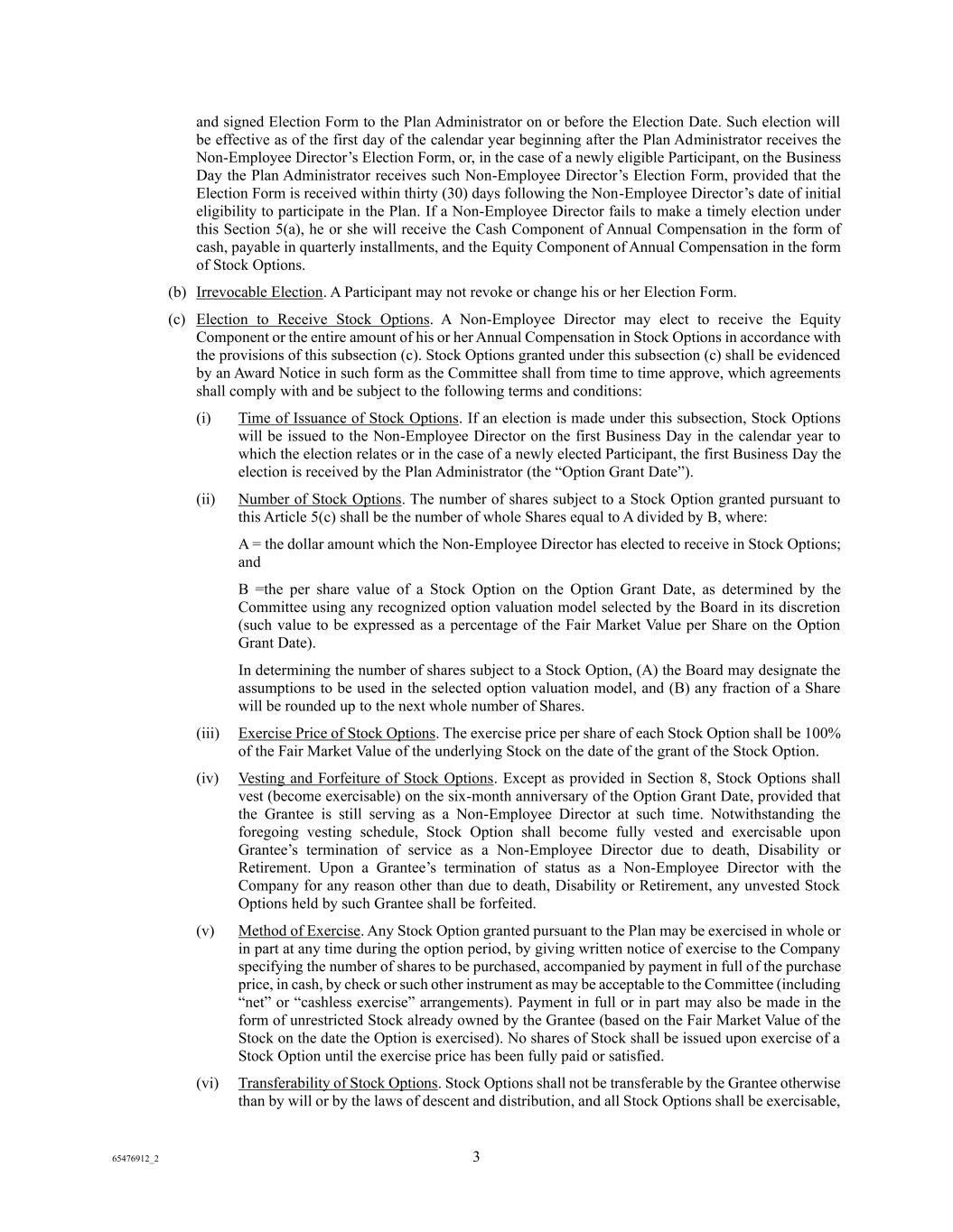 65476912_2 3 and signed Election Form to the Plan Administrator on or before the Election Date. Such election will be effective as of the first day of the calendar year beginning after the Plan Administrator receives the Non-Employee Director’s Election Form, or, in the case of a newly eligible Participant, on the Business Day the Plan Administrator receives such Non-Employee Director’s Election Form, provided that the Election Form is received within thirty (30) days following the Non-Employee Director’s date of initial eligibility to participate in the Plan. If a Non-Employee Director fails to make a timely election under this Section 5(a), he or she will receive the Cash Component of Annual Compensation in the form of cash, payable in quarterly installments, and the Equity Component of Annual Compensation in the form of Stock Options. (b) Irrevocable Election. A Participant may not revoke or change his or her Election Form. (c) Election to Receive Stock Options. A Non-Employee Director may elect to receive the Equity Component or the entire amount of his or her Annual Compensation in Stock Options in accordance with the provisions of this subsection (c). Stock Options granted under this subsection (c) shall be evidenced by an Award Notice in such form as the Committee shall from time to time approve, which agreements shall comply with and be subject to the following terms and conditions: (i) Time of Issuance of Stock Options. If an election is made under this subsection, Stock Options will be issued to the Non-Employee Director on the first Business Day in the calendar year to which the election relates or in the case of a newly elected Participant, the first Business Day the election is received by the Plan Administrator (the “Option Grant Date”). (ii) Number of Stock Options. The number of shares subject to a Stock Option granted pursuant to this Article 5(c) shall be the number of whole Shares equal to A divided by B, where: A = the dollar amount which the Non-Employee Director has elected to receive in Stock Options; and B =the per share value of a Stock Option on the Option Grant Date, as determined by the Committee using any recognized option valuation model selected by the Board in its discretion (such value to be expressed as a percentage of the Fair Market Value per Share on the Option Grant Date). In determining the number of shares subject to a Stock Option, (A) the Board may designate the assumptions to be used in the selected option valuation model, and (B) any fraction of a Share will be rounded up to the next whole number of Shares. (iii) Exercise Price of Stock Options. The exercise price per share of each Stock Option shall be 100% of the Fair Market Value of the underlying Stock on the date of the grant of the Stock Option. (iv) Vesting and Forfeiture of Stock Options. Except as provided in Section 8, Stock Options shall vest (become exercisable) on the six-month anniversary of the Option Grant Date, provided that the Grantee is still serving as a Non-Employee Director at such time. Notwithstanding the foregoing vesting schedule, Stock Option shall become fully vested and exercisable upon Grantee’s termination of service as a Non-Employee Director due to death, Disability or Retirement. Upon a Grantee’s termination of status as a Non-Employee Director with the Company for any reason other than due to death, Disability or Retirement, any unvested Stock Options held by such Grantee shall be forfeited. (v) Method of Exercise. Any Stock Option granted pursuant to the Plan may be exercised in whole or in part at any time during the option period, by giving written notice of exercise to the Company specifying the number of shares to be purchased, accompanied by payment in full of the purchase price, in cash, by check or such other instrument as may be acceptable to the Committee (including “net” or “cashless exercise” arrangements). Payment in full or in part may also be made in the form of unrestricted Stock already owned by the Grantee (based on the Fair Market Value of the Stock on the date the Option is exercised). No shares of Stock shall be issued upon exercise of a Stock Option until the exercise price has been fully paid or satisfied. (vi) Transferability of Stock Options. Stock Options shall not be transferable by the Grantee otherwise than by will or by the laws of descent and distribution, and all Stock Options shall be exercisable,