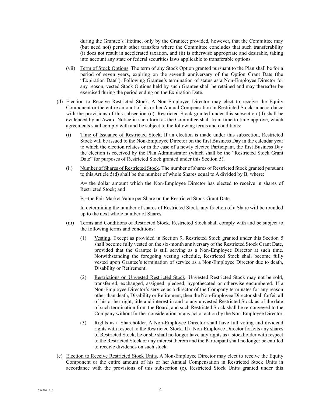 65476912_2 4 during the Grantee’s lifetime, only by the Grantee; provided, however, that the Committee may (but need not) permit other transfers where the Committee concludes that such transferability (i) does not result in accelerated taxation, and (ii) is otherwise appropriate and desirable, taking into account any state or federal securities laws applicable to transferable options. (vii) Term of Stock Options. The term of any Stock Option granted pursuant to the Plan shall be for a period of seven years, expiring on the seventh anniversary of the Option Grant Date (the “Expiration Date”). Following Grantee’s termination of status as a Non-Employee Director for any reason, vested Stock Options held by such Grantee shall be retained and may thereafter be exercised during the period ending on the Expiration Date. (d) Election to Receive Restricted Stock. A Non-Employee Director may elect to receive the Equity Component or the entire amount of his or her Annual Compensation in Restricted Stock in accordance with the provisions of this subsection (d). Restricted Stock granted under this subsection (d) shall be evidenced by an Award Notice in such form as the Committee shall from time to time approve, which agreements shall comply with and be subject to the following terms and conditions: (i) Time of Issuance of Restricted Stock. If an election is made under this subsection, Restricted Stock will be issued to the Non-Employee Director on the first Business Day in the calendar year to which the election relates or in the case of a newly elected Participant, the first Business Day the election is received by the Plan Administrator (which shall be the “Restricted Stock Grant Date” for purposes of Restricted Stock granted under this Section 5). (ii) Number of Shares of Restricted Stock. The number of shares of Restricted Stock granted pursuant to this Article 5(d) shall be the number of whole Shares equal to A divided by B, where: A= the dollar amount which the Non-Employee Director has elected to receive in shares of Restricted Stock; and B =the Fair Market Value per Share on the Restricted Stock Grant Date. In determining the number of shares of Restricted Stock, any fraction of a Share will be rounded up to the next whole number of Shares. (iii) Terms and Conditions of Restricted Stock. Restricted Stock shall comply with and be subject to the following terms and conditions: (1) Vesting. Except as provided in Section 9, Restricted Stock granted under this Section 5 shall become fully vested on the six-month anniversary of the Restricted Stock Grant Date, provided that the Grantee is still serving as a Non-Employee Director at such time. Notwithstanding the foregoing vesting schedule, Restricted Stock shall become fully vested upon Grantee’s termination of service as a Non-Employee Director due to death, Disability or Retirement. (2) Restrictions on Unvested Restricted Stock. Unvested Restricted Stock may not be sold, transferred, exchanged, assigned, pledged, hypothecated or otherwise encumbered. If a Non-Employee Director’s service as a director of the Company terminates for any reason other than death, Disability or Retirement, then the Non-Employee Director shall forfeit all of his or her right, title and interest in and to any unvested Restricted Stock as of the date of such termination from the Board, and such Restricted Stock shall be re-conveyed to the Company without further consideration or any act or action by the Non-Employee Director. (3) Rights as a Shareholder. A Non-Employee Director shall have full voting and dividend rights with respect to the Restricted Stock. If a Non-Employee Director forfeits any shares of Restricted Stock, he or she shall no longer have any rights as a stockholder with respect to the Restricted Stock or any interest therein and the Participant shall no longer be entitled to receive dividends on such stock. (e) Election to Receive Restricted Stock Units. A Non-Employee Director may elect to receive the Equity Component or the entire amount of his or her Annual Compensation in Restricted Stock Units in accordance with the provisions of this subsection (e). Restricted Stock Units granted under this