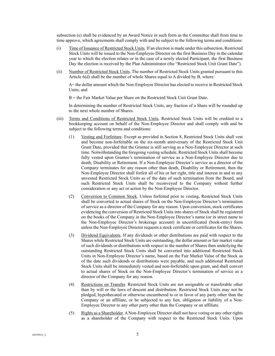 65476912_2 5 subsection (e) shall be evidenced by an Award Notice in such form as the Committee shall from time to time approve, which agreements shall comply with and be subject to the following terms and conditions: (i) Time of Issuance of Restricted Stock Units. If an election is made under this subsection, Restricted Stock Units will be issued to the Non-Employee Director on the first Business Day in the calendar year to which the election relates or in the case of a newly elected Participant, the first Business Day the election is received by the Plan Administrator (the “Restricted Stock Unit Grant Date”). (ii) Number of Restricted Stock Units. The number of Restricted Stock Units granted pursuant to this Article 6(d) shall be the number of whole Shares equal to A divided by B, where: A= the dollar amount which the Non-Employee Director has elected to receive in Restricted Stock Units; and B = the Fair Market Value per Share on the Restricted Stock Unit Grant Date. In determining the number of Restricted Stock Units, any fraction of a Share will be rounded up to the next whole number of Shares. (iii) Terms and Conditions of Restricted Stock Units. Restricted Stock Units will be credited to a bookkeeping account on behalf of the Non-Employee Director and shall comply with and be subject to the following terms and conditions: (1) Vesting and Forfeiture. Except as provided in Section 8, Restricted Stock Units shall vest and become non-forfeitable on the six-month anniversary of the Restricted Stock Unit Grant Date, provided that the Grantee is still serving as a Non-Employee Director at such time. Notwithstanding the foregoing vesting schedule, Restricted Stock Units shall become fully vested upon Grantee’s termination of service as a Non-Employee Director due to death, Disability or Retirement. If a Non-Employee Director’s service as a director of the Company terminates for any reason other than death, Disability or Retirement, then the Non-Employee Director shall forfeit all of his or her right, title and interest in and to any unvested Restricted Stock Units as of the date of such termination from the Board, and such Restricted Stock Units shall be reconveyed to the Company without further consideration or any act or action by the Non-Employee Director. (2) Conversion to Common Stock. Unless forfeited prior to vesting, Restricted Stock Units shall be converted to actual shares of Stock on the Non-Employee Director’s termination of service as a director of the Company for any reason. Upon conversion, stock certificates evidencing the conversion of Restricted Stock Units into shares of Stock shall be registered on the books of the Company in the Non-Employee Director’s name (or in street name to the Non-Employee Director’s brokerage account) in uncertificated (book-entry) form unless the Non-Employee Director requests a stock certificate or certificates for the Shares. (3) Dividend Equivalents. If any dividends or other distributions are paid with respect to the Shares while Restricted Stock Units are outstanding, the dollar amount or fair market value of such dividends or distributions with respect to the number of Shares then underlying the outstanding Restricted Stock Units shall be converted into additional Restricted Stock Units in Non-Employee Director’s name, based on the Fair Market Value of the Stock as of the date such dividends or distributions were payable, and such additional Restricted Stock Units shall be immediately vested and non-forfeitable upon grant, and shall convert to actual shares of Stock on the Non-Employee Director’s termination of service as a director of the Company for any reason. (4) Restrictions on Transfer. Restricted Stock Units are not assignable or transferable other than by will or the laws of descent and distribution. Restricted Stock Units may not be pledged, hypothecated or otherwise encumbered to or in favor of any party other than the Company or an affiliate, or be subjected to any lien, obligation or liability of a Non- Employee Director to any other party other than the Company or an affiliate. (5) Rights as a Shareholder. A Non-Employee Director shall not have voting or any other rights as a shareholder of the Company with respect to the Restricted Stock Units. Upon
