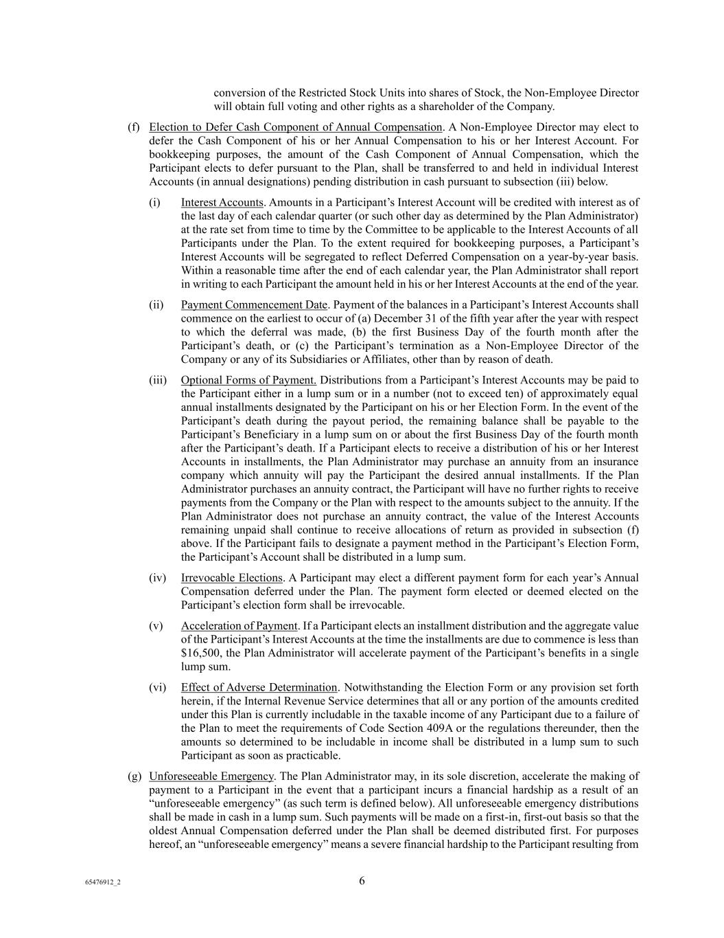 65476912_2 6 conversion of the Restricted Stock Units into shares of Stock, the Non-Employee Director will obtain full voting and other rights as a shareholder of the Company. (f) Election to Defer Cash Component of Annual Compensation. A Non-Employee Director may elect to defer the Cash Component of his or her Annual Compensation to his or her Interest Account. For bookkeeping purposes, the amount of the Cash Component of Annual Compensation, which the Participant elects to defer pursuant to the Plan, shall be transferred to and held in individual Interest Accounts (in annual designations) pending distribution in cash pursuant to subsection (iii) below. (i) Interest Accounts. Amounts in a Participant’s Interest Account will be credited with interest as of the last day of each calendar quarter (or such other day as determined by the Plan Administrator) at the rate set from time to time by the Committee to be applicable to the Interest Accounts of all Participants under the Plan. To the extent required for bookkeeping purposes, a Participant’s Interest Accounts will be segregated to reflect Deferred Compensation on a year-by-year basis. Within a reasonable time after the end of each calendar year, the Plan Administrator shall report in writing to each Participant the amount held in his or her Interest Accounts at the end of the year. (ii) Payment Commencement Date. Payment of the balances in a Participant’s Interest Accounts shall commence on the earliest to occur of (a) December 31 of the fifth year after the year with respect to which the deferral was made, (b) the first Business Day of the fourth month after the Participant’s death, or (c) the Participant’s termination as a Non-Employee Director of the Company or any of its Subsidiaries or Affiliates, other than by reason of death. (iii) Optional Forms of Payment. Distributions from a Participant’s Interest Accounts may be paid to the Participant either in a lump sum or in a number (not to exceed ten) of approximately equal annual installments designated by the Participant on his or her Election Form. In the event of the Participant’s death during the payout period, the remaining balance shall be payable to the Participant’s Beneficiary in a lump sum on or about the first Business Day of the fourth month after the Participant’s death. If a Participant elects to receive a distribution of his or her Interest Accounts in installments, the Plan Administrator may purchase an annuity from an insurance company which annuity will pay the Participant the desired annual installments. If the Plan Administrator purchases an annuity contract, the Participant will have no further rights to receive payments from the Company or the Plan with respect to the amounts subject to the annuity. If the Plan Administrator does not purchase an annuity contract, the value of the Interest Accounts remaining unpaid shall continue to receive allocations of return as provided in subsection (f) above. If the Participant fails to designate a payment method in the Participant’s Election Form, the Participant’s Account shall be distributed in a lump sum. (iv) Irrevocable Elections. A Participant may elect a different payment form for each year’s Annual Compensation deferred under the Plan. The payment form elected or deemed elected on the Participant’s election form shall be irrevocable. (v) Acceleration of Payment. If a Participant elects an installment distribution and the aggregate value of the Participant’s Interest Accounts at the time the installments are due to commence is less than $16,500, the Plan Administrator will accelerate payment of the Participant’s benefits in a single lump sum. (vi) Effect of Adverse Determination. Notwithstanding the Election Form or any provision set forth herein, if the Internal Revenue Service determines that all or any portion of the amounts credited under this Plan is currently includable in the taxable income of any Participant due to a failure of the Plan to meet the requirements of Code Section 409A or the regulations thereunder, then the amounts so determined to be includable in income shall be distributed in a lump sum to such Participant as soon as practicable. (g) Unforeseeable Emergency. The Plan Administrator may, in its sole discretion, accelerate the making of payment to a Participant in the event that a participant incurs a financial hardship as a result of an “unforeseeable emergency” (as such term is defined below). All unforeseeable emergency distributions shall be made in cash in a lump sum. Such payments will be made on a first-in, first-out basis so that the oldest Annual Compensation deferred under the Plan shall be deemed distributed first. For purposes hereof, an “unforeseeable emergency” means a severe financial hardship to the Participant resulting from