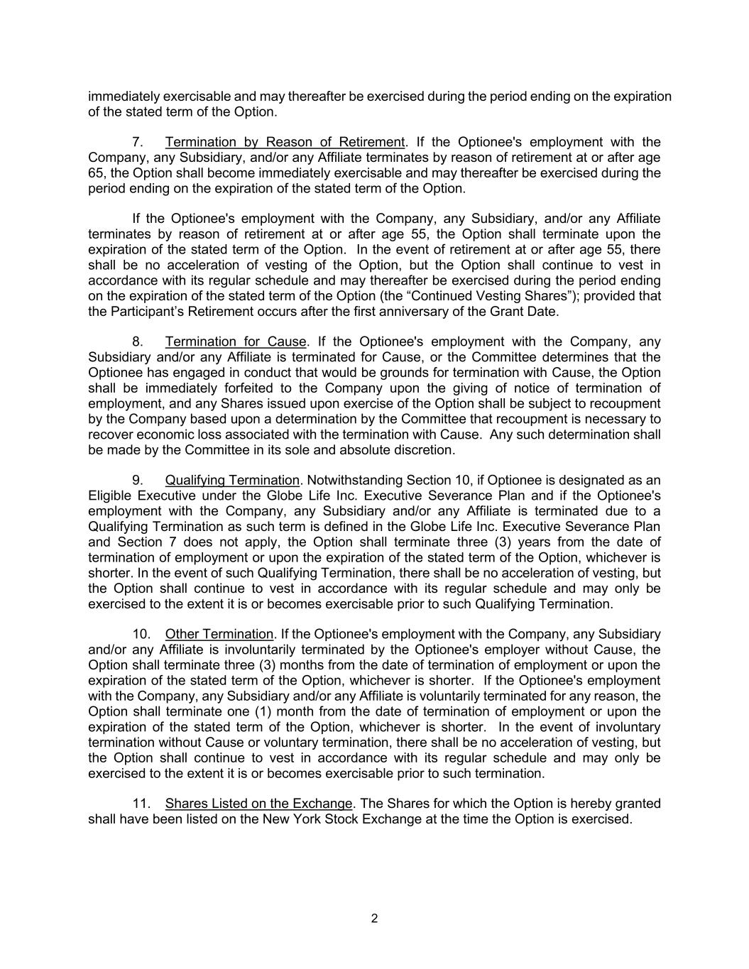 2 immediately exercisable and may thereafter be exercised during the period ending on the expiration of the stated term of the Option. 7. Termination by Reason of Retirement. If the Optionee's employment with the Company, any Subsidiary, and/or any Affiliate terminates by reason of retirement at or after age 65, the Option shall become immediately exercisable and may thereafter be exercised during the period ending on the expiration of the stated term of the Option. If the Optionee's employment with the Company, any Subsidiary, and/or any Affiliate terminates by reason of retirement at or after age 55, the Option shall terminate upon the expiration of the stated term of the Option. In the event of retirement at or after age 55, there shall be no acceleration of vesting of the Option, but the Option shall continue to vest in accordance with its regular schedule and may thereafter be exercised during the period ending on the expiration of the stated term of the Option (the “Continued Vesting Shares”); provided that the Participant’s Retirement occurs after the first anniversary of the Grant Date. 8. Termination for Cause. If the Optionee's employment with the Company, any Subsidiary and/or any Affiliate is terminated for Cause, or the Committee determines that the Optionee has engaged in conduct that would be grounds for termination with Cause, the Option shall be immediately forfeited to the Company upon the giving of notice of termination of employment, and any Shares issued upon exercise of the Option shall be subject to recoupment by the Company based upon a determination by the Committee that recoupment is necessary to recover economic loss associated with the termination with Cause. Any such determination shall be made by the Committee in its sole and absolute discretion. 9. Qualifying Termination. Notwithstanding Section 10, if Optionee is designated as an Eligible Executive under the Globe Life Inc. Executive Severance Plan and if the Optionee's employment with the Company, any Subsidiary and/or any Affiliate is terminated due to a Qualifying Termination as such term is defined in the Globe Life Inc. Executive Severance Plan and Section 7 does not apply, the Option shall terminate three (3) years from the date of termination of employment or upon the expiration of the stated term of the Option, whichever is shorter. In the event of such Qualifying Termination, there shall be no acceleration of vesting, but the Option shall continue to vest in accordance with its regular schedule and may only be exercised to the extent it is or becomes exercisable prior to such Qualifying Termination. 10. Other Termination. If the Optionee's employment with the Company, any Subsidiary and/or any Affiliate is involuntarily terminated by the Optionee's employer without Cause, the Option shall terminate three (3) months from the date of termination of employment or upon the expiration of the stated term of the Option, whichever is shorter. If the Optionee's employment with the Company, any Subsidiary and/or any Affiliate is voluntarily terminated for any reason, the Option shall terminate one (1) month from the date of termination of employment or upon the expiration of the stated term of the Option, whichever is shorter. In the event of involuntary termination without Cause or voluntary termination, there shall be no acceleration of vesting, but the Option shall continue to vest in accordance with its regular schedule and may only be exercised to the extent it is or becomes exercisable prior to such termination. 11. Shares Listed on the Exchange. The Shares for which the Option is hereby granted shall have been listed on the New York Stock Exchange at the time the Option is exercised.