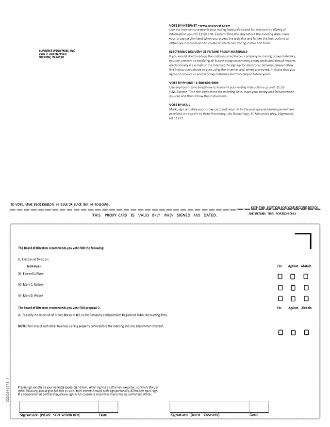 0000242173_1 SUPREME INDUSTRIES, INC. 2581 E. KERCHER RD. GOSHEN, IN 46528 VOTE BY INTERNET - www.proxyvote.com Use the Internet to transmit your voting instructions and for electronic delivery of information up until 11:59 P.M. Eastern Time the day before the meeting date. Have your proxy card in hand when you access the web site and follow the instructions to obtain your records and to create an electronic voting instruction form. ELECTRONIC DELIVERY OF FUTURE PROXY MATERIALS If you would like to reduce the costs incurred by our company in mailing proxy materials, you can consent to receiving all future proxy statements, proxy cards and annual reports electronically via e-mail or the Internet. To sign up for electronic delivery, please follow the instructions above to vote using the Internet and, when prompted, indicate that you agree to receive or access proxy materials electronically in future years. VOTE BY PHONE - 1-800-690-6903 Use any touch-tone telephone to transmit your voting instructions up until 11:59 P.M. Eastern Time the day before the meeting date. Have your proxy card in hand when you call and then follow the instructions. VOTE BY MAIL Mark, sign and date your proxy card and return it in the postage-paid envelope we have provided or return it to Vote Processing, c/o Broadridge, 51 Mercedes Way, Edgewood, NY 11717. TO VOTE, MARK BLOCKS BELOW IN BLUE OR BLACK INK AS FOLLOWS: THIS PROXY CARD IS VALID ONLY WHEN SIGNED AND DATED. KEEP THIS PORTION FOR YOUR RECORDS DETACH AND RETURN THIS PORTION ONLY The Board of Directors recommends you vote FOR the following: 1. Election of Directors Nominees 01 Edward L. Flynn 02 Mark C. Neilson 03 Mark D. Weber For Against Abstain The Board of Directors recommends you vote FOR proposal 2. For Against Abstain 2. To ratify the selection of Crowe Horwath LLP as the Company's Independent Registered Public Accounting Firm. NOTE: To transact such other business as may properly come before the meeting and any adjournment thereof. Please sign exactly as your name(s) appear(s) hereon. When signing as attorney, executor, administrator, or other fiduciary, please give full title as such. Joint owners should each sign personally. All holders must sign. If a corporation or partnership, please sign in full corporate or partnership name, by authorized officer. Signature [PLEASE SIGN WITHIN BOX] Date Signature (Joint Owners) Date |