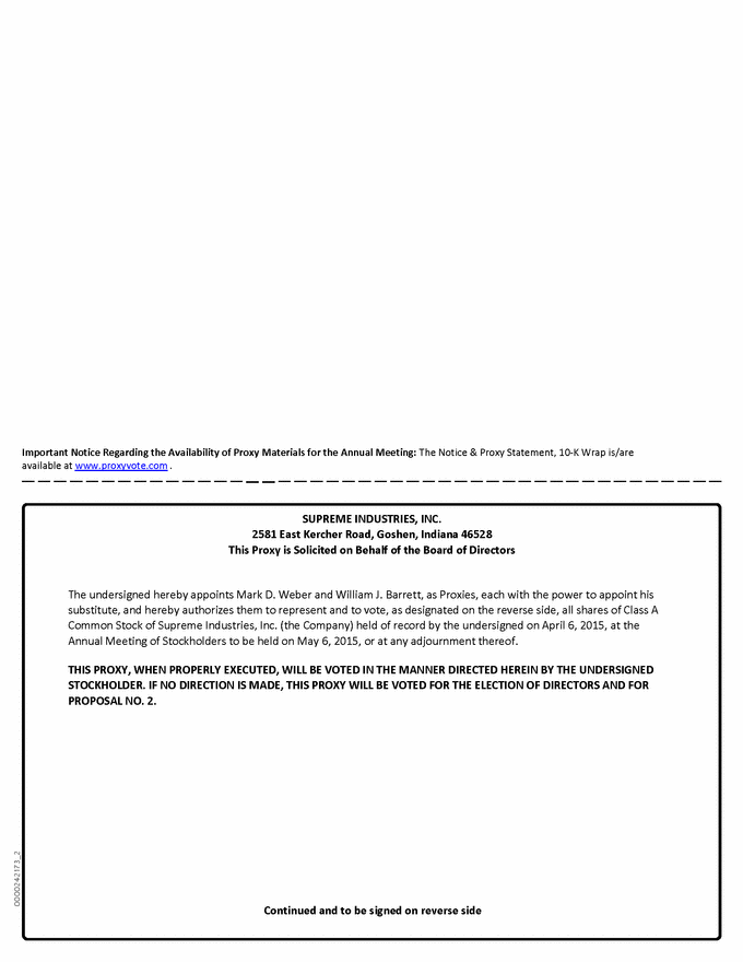 0000242173_2 Important Notice Regarding the Availability of Proxy Materials for the Annual Meeting: The Notice & Proxy Statement, 10-K Wrap is/are available at www.proxyvote.com . SUPREME INDUSTRIES, INC. 2581 East Kercher Road, Goshen, Indiana 46528 This Proxy is Solicited on Behalf of the Board of Directors The undersigned hereby appoints Mark D. Weber and William J. Barrett, as Proxies, each with the power to appoint his substitute, and hereby authorizes them to represent and to vote, as designated on the reverse side, all shares of Class A Common Stock of Supreme Industries, Inc. (the Company) held of record by the undersigned on April 6, 2015, at the Annual Meeting of Stockholders to be held on May 6, 2015, or at any adjournment thereof. THIS PROXY, WHEN PROPERLY EXECUTED, WILL BE VOTED IN THE MANNER DIRECTED HEREIN BY THE UNDERSIGNED STOCKHOLDER. IF NO DIRECTION IS MADE, THIS PROXY WILL BE VOTED FOR THE ELECTION OF DIRECTORS AND FOR PROPOSAL NO. 2. Continued and to be signed on reverse side |