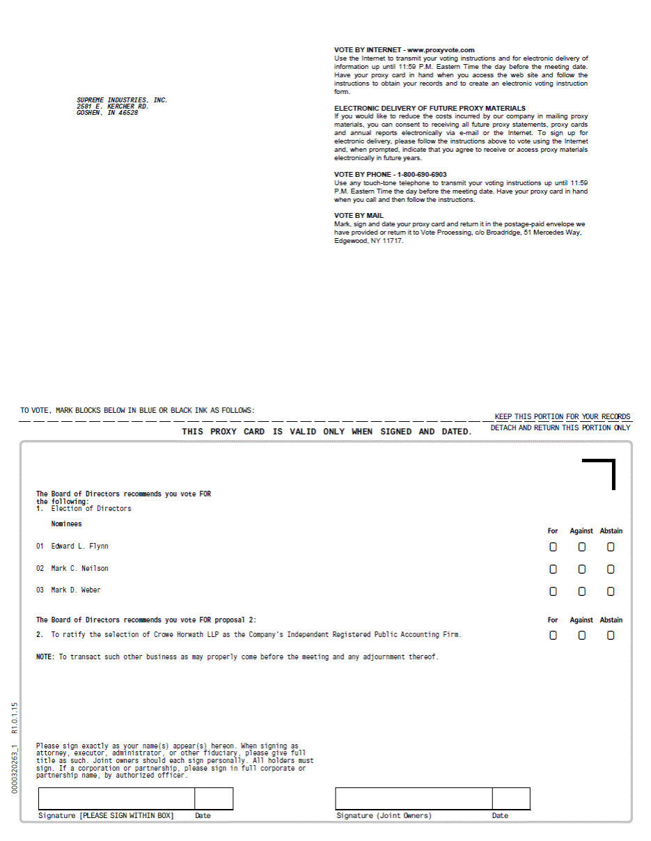 VOTE BY INTERNET - www.proxyvote.com Use the Internet to transmit your voting instructions and for electronic delivery of information up until 11:59 P.M. Eastern Time the day before the meeting date. Have your proxy card in hand when you access the web site and follow the instructions to obtain your records and to create an electronic voting instruction form. SUPREME INDUSTRIES, INC. 2581 E. KERCHER RD. GOSHEN, IN 46528 ELECTRONIC DELIVERY OF FUTURE PROXY MATERIALS If you would like to reduce the costs incurred by our company in mailing proxy materials, you can consent to receiving all future proxy statements, proxy cards and annual reports electronically via e-mail or the Internet. To sign up for electronic delivery, please follow the instructions above to vote using the Internet and, when prompted, indicate that you agree to receive or access proxy materials electronically in future years. VOTE BY PHONE - 1-800-690-6903 Use any touch-tone telephone to transmit your voting instructions up until 11:59 P.M. Eastern Time the day before the meeting date. Have your proxy card in hand when you call and then follow the instructions. VOTE BY MAIL Mark, sign and date your proxy card and return it in the postage-paid envelope we have provided or return it to Vote Processing, c/o Broadridge, 51 Mercedes Way, Edgewood, NY 11717. TO VOTE, MARK BLOCKS BELOW IN BLUE OR BLACK INK AS FOLLOWS: KEEP THIS PORTION FOR YOUR RECORDS DETACH AND RETURN THIS PORTION ONLY THIS PROXY CARD IS VALID ONLY WHEN SIGNED AND DATED. The Board of Directors recommends you vote FOR the following: 1. Election of Directors Nominees For 0 0 0 For 0 Against 0 0 0 Against 0 Abstain 0 0 0 Abstain 0 01 Edward L. Flynn 02 Mark C. Neilson 03 Mark D. Weber The Board of Directors recommends you vote FOR proposal 2: 2. To ratify the selection of Crowe Horwath LLP as the Company's Independent Registered Public Accounting Firm. NOTE: To transact such other business as may properly come before the meeting and any adjournment thereof. Please sign exactly as your name(s) appear(s) hereon. When signing as attorney, executor, administrator, or other fiduciary, please give full title as such. Joint owners should each sign personally. All holders must sign. If a corporation or partnership, please sign in full corporate or partnership name, by authorized officer. Signature [PLEASE SIGN WITHIN BOX] Date Signature (Joint Owners) Date 0000320263_1 R1.0.1.15