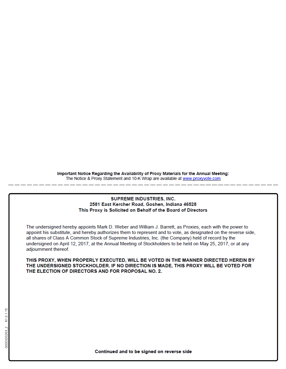 Important Notice Regarding the Availability of Proxy Materials for the Annual Meeting: The Notice & Proxy Statement and 10-K Wrap are available at www.proxyvote.com SUPREME INDUSTRIES, INC. 2581 East Kercher Road, Goshen, Indiana 46528 This Proxy is Solicited on Behalf of the Board of Directors The undersigned hereby appoints Mark D. Weber and William J. Barrett, as Proxies, each with the power to appoint his substitute, and hereby authorizes them to represent and to vote, as designated on the reverse side, all shares of Class A Common Stock of Supreme Industries, Inc. (the Company) held of record by the undersigned on April 12, 2017, at the Annual Meeting of Stockholders to be held on May 25, 2017, or at any adjournment thereof. THIS PROXY, WHEN PROPERLY EXECUTED, WILL BE VOTED IN THE MANNER DIRECTED HEREIN BY THE UNDERSIGNED STOCKHOLDER. IF NO DIRECTION IS MADE, THIS PROXY WILL BE VOTED FOR THE ELECTION OF DIRECTORS AND FOR PROPOSAL NO. 2. Continued and to be signed on reverse side 0000320263_2 R1.0.1.15