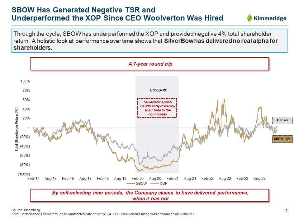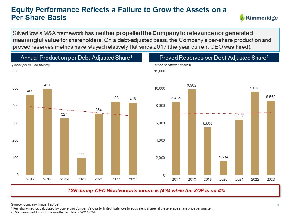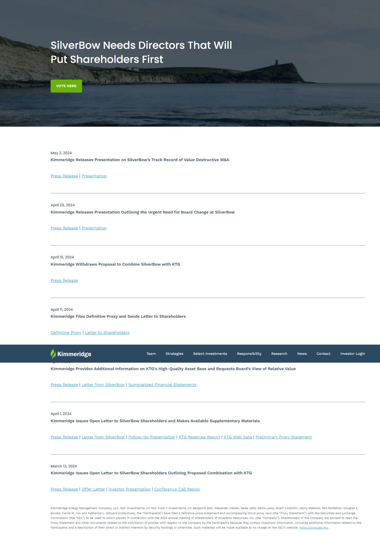 NEW YORK and DENVER, May 2, 2024 – Kimmeridge, an alternative asset manager focused on the energy sector and the largest shareholder of SilverBow Resources ("SilverBow" or the “Company”) holding 12.9% of outstanding shares, today released an investor presentation detailing SilverBow’s consistent track record of value destructive M&A.