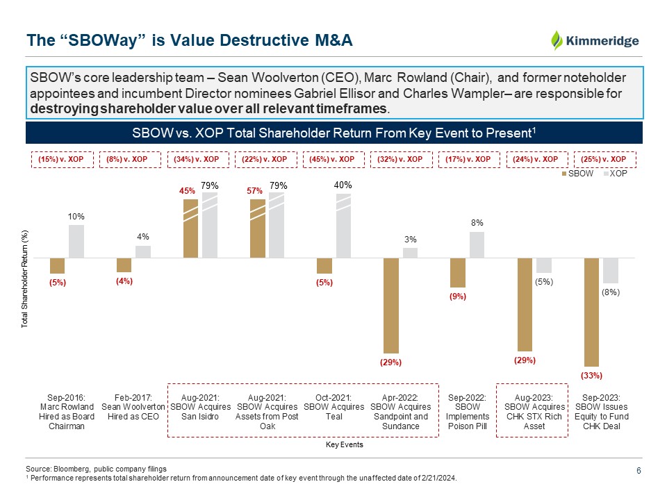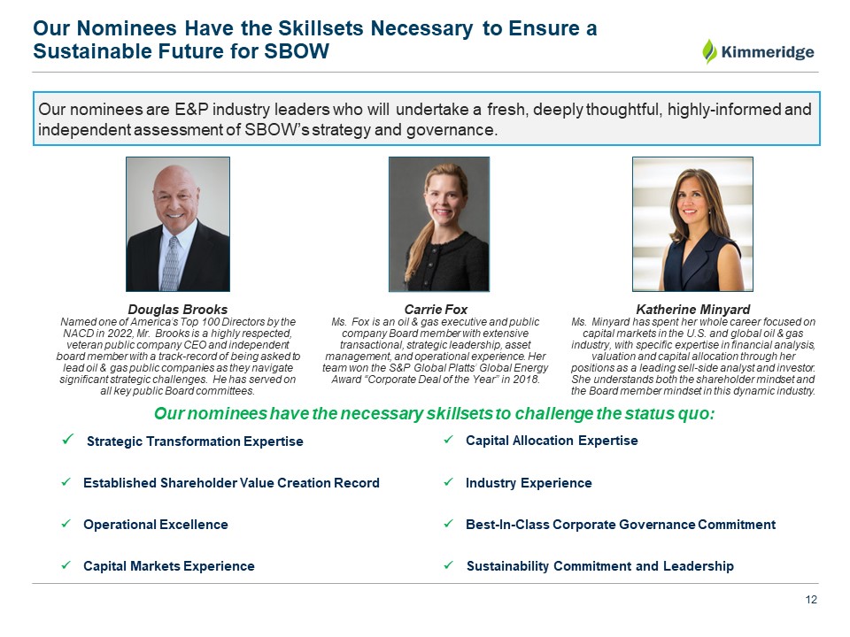 To advance the best interests of all SilverBow shareholders and challenge the existing Board’s status quo mindset, Kimmeridge has nominated three highly-qualified, independent director candidates – Carrie Fox, Douglas Brooks, and Katherine Minyard – for election at the 2024 annual meeting. In contrast to SilverBow’s incumbent directors, Kimmeridge’s nominees are E&P industry leaders who have the necessary skills – including transaction expertise, track records of effective capital allocation and M&A, and a proven commitment to best-in-class corporate governance – to address the long-standing historical challenges that have constrained SilverBow’s performance.