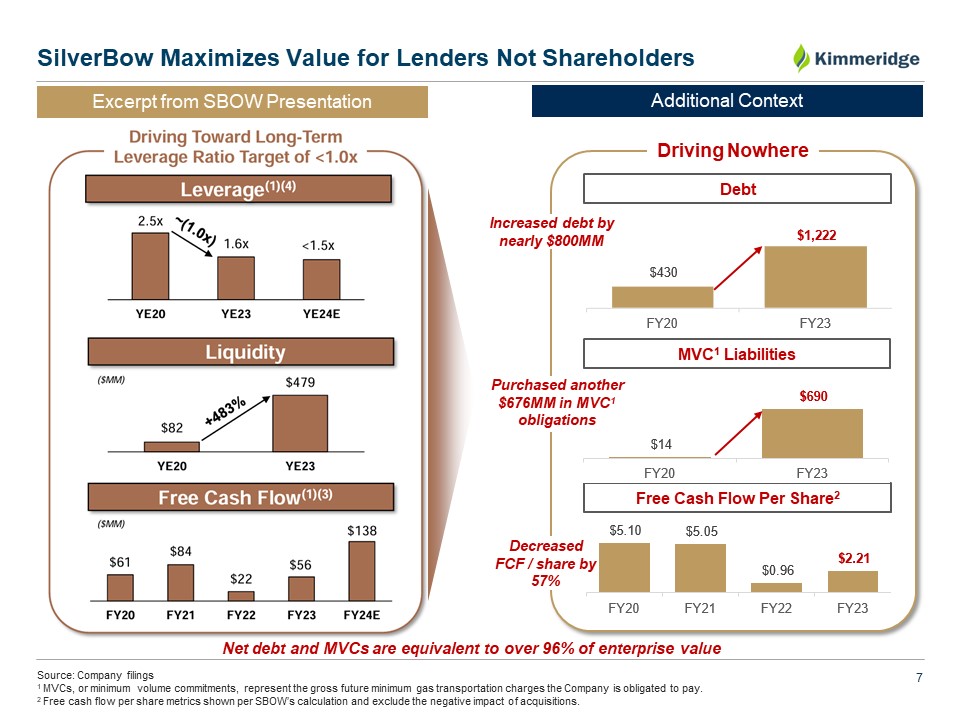 SilverBow has pursued a failed M&A strategy that has put its balance sheet at risk – adding debt and minimum volume commitments that now represent over 96% of the Company’s enterprise value – while consistently destroying shareholder value. As noted in the presentation: