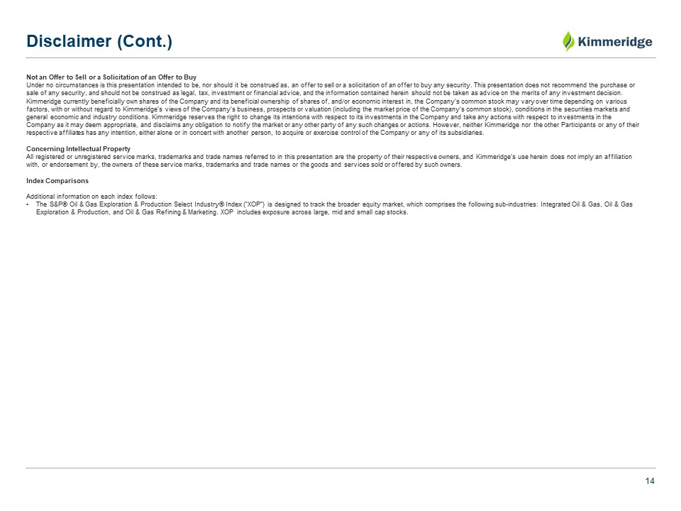 This press release does not constitute an offer to sell or solicitation of an offer to buy any of the securities described herein in any state to any person. The information herein contains "forward-looking statements". Specific forward-looking statements can be identified by the fact that they do not relate strictly to historical or current facts and include, without limitation, words such as "may," "will," "expects," "believes," "anticipates," "plans," "estimates," "projects," "potential," "targets," "forecasts," "seeks," "could," "should" or the negative of such terms or other variations on such terms or comparable terminology. Similarly, statements that describe our objectives, plans or goals are forward-looking. Forward-looking statements are subject to various risks and uncertainties and assumptions. There can be no assurance that any idea or assumption herein is, or will be proven, correct or that any of the objectives, plans or goals stated herein will ultimately be undertaken or achieved. If one or more of such risks or uncertainties materialize, or if Kimmeridge underlying assumptions prove to be incorrect, the actual results may vary materially from outcomes indicated by these statements. Accordingly, forward-looking statements should not be regarded as a representation by Kimmeridge that the future plans, estimates or expectations contemplated will ever be achieved.