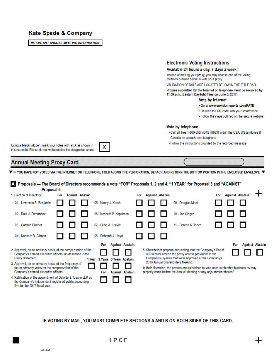 Kate Spade & Company IMPORTANT ANNUAL MEETING INFORMATION Electronic Voting Instructions Available 24 hours a day, 7 days a week! Instead of mailing your proxy, you may choose one of the voting methods outlined below to vote your proxy. VALIDATION DETAILS ARE LOCATED BELOW IN THE TITLE BAR. Proxies submitted by the Internet or telephone must be received by 11:59 p.m., Eastern Daylight Time on June 5, 2017. Vote by Internet • Go to www.envisionreports.com/KATE • Or scan the QR code with your smartphone • Follow the steps outlined on the secure website X Vote by telephone • Call toll free 1-800-652-VOTE (8683) within the USA, US territories & Canada on a touch tone telephone • Follow the instructions provided by the recorded message Annual Meeting Proxy Card q IF YOU HAVE NOT VOTED VIA THE INTERNET OR TELEPHONE, FOLD ALONG THE PERFORATION, DETACH AND RETURN THE BOTTOM PORTION IN THE ENCLOSED ENVELOPE. q + 1. Election of Directors:For Against AbstainFor Against AbstainFor Against Abstain 01 - Lawrence S. Benjamin 02 - Raul J. Fernandez 03 - Carsten Fischer 05 - Nancy J. Karch 06 - Kenneth P. Kopelman 07 - Craig A. Leavitt 09 - Douglas Mack 10 - Jan Singer 11 - Doreen A. Toben 04 - Kenneth B. Gilman08 - Deborah J. Lloyd 2. Approval, on an advisory basis, of the compensation of the Company’s named executive officers, as described in the ForAgainst Abstain 5. Shareholder proposal requesting that the Company’s Board of Directors amend the proxy access provisions in the ForAgainst Abstain Proxy Statement. 3. Approval, on an advisory basis, of the frequency of future advisory votes on the compensation of the Company’s named executive officers. 1 Year 2 Years 3 Years Abstain ForAgainst Abstain Company’s By-laws that were approved at the Company’s 2016 Annual Shareholders Meeting. In their discretion, the proxies are authorized to vote upon such other business as may properly come before the Annual Meeting or any adjournment thereof. 4. Ratification of the appointment of Deloitte & Touche LLP as the Company’s independent registered public accounting firm for the 2017 fiscal year. IF VOTING BY MAIL, YOU MUST COMPLETE SECTIONS A AND B ON BOTH SIDES OF THIS CARD.