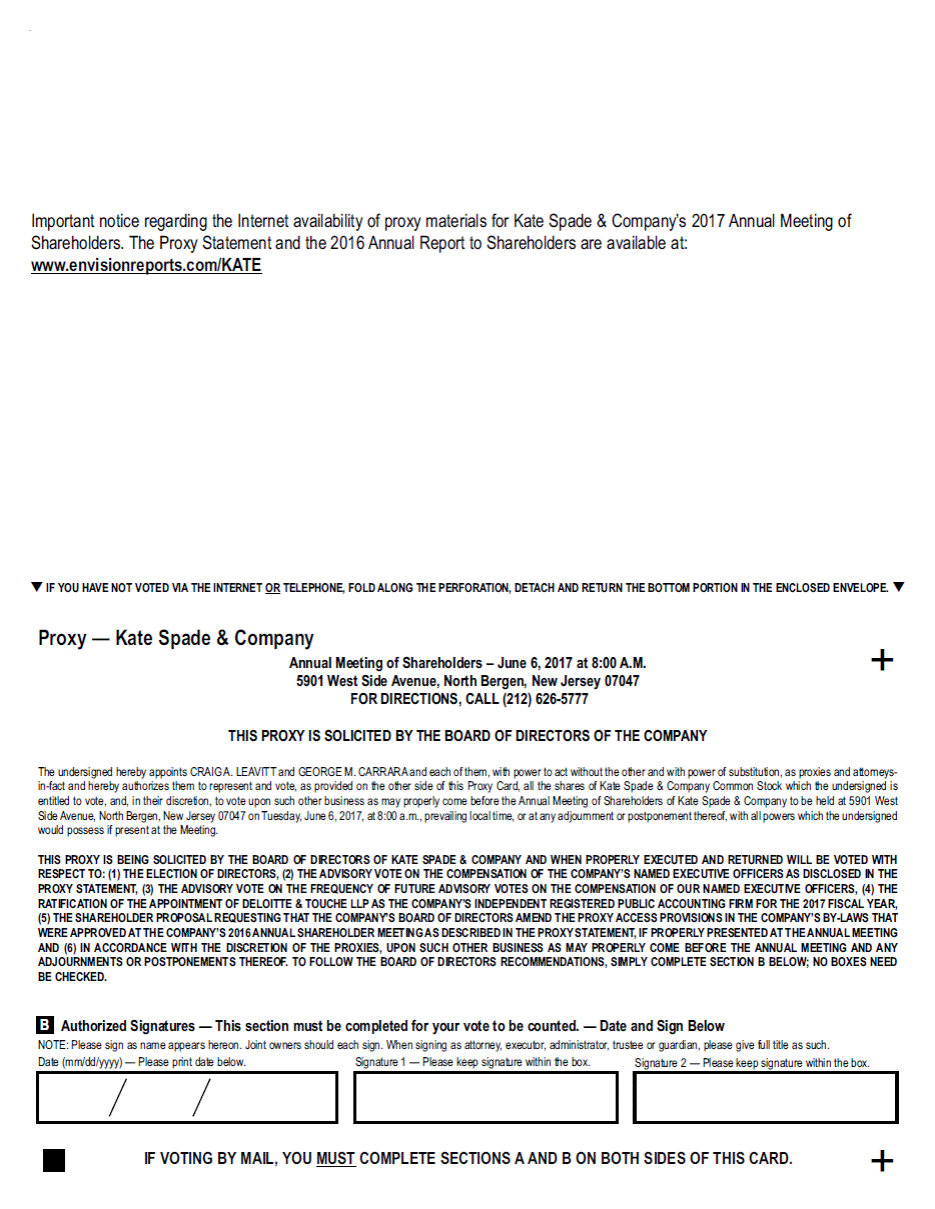 Important notice regarding the Internet availability of proxy materials for Kate Spade & Company’s 2017 Annual Meeting of Shareholders. The Proxy Statement and the 2016 Annual Report to Shareholders are available at: www.envisionreports.com/KATE q IF YOU HAVE NOT VOTED VIA THE INTERNET OR TELEPHONE, FOLD ALONG THE PERFORATION, DETACH AND RETURN THE BOTTOM PORTION IN THE ENCLOSED ENVELOPE. q + Annual Meeting of Shareholders – June 6, 2017 at 8:00 A.M. 5901 West Side Avenue, North Bergen, New Jersey 07047 FOR DIRECTIONS, CALL (212) 626-5777 THIS PROXY IS SOLICITED BY THE BOARD OF DIRECTORS OF THE COMPANY The undersigned hereby appoints CRAIG A. LEAVITT and GEORGE M. CARRARA and each of them, with power to act without the other and with power of substitution, as proxies and attorneys-in-fact and hereby authorizes them to represent and vote, as provided on the other side of this Proxy Card, all the shares of Kate Spade & Company Common Stock which the undersigned is entitled to vote, and, in their discretion, to vote upon such other business as may properly come before the Annual Meeting of Shareholders of Kate Spade & Company to be held at 5901 West Side Avenue, North Bergen, New Jersey 07047 on Tuesday, June 6, 2017, at 8:00 a.m., prevailing local time, or at any adjournment or postponement thereof, with all powers which the undersigned would possess if present at the Meeting. THIS PROXY IS BEING SOLICITED BY THE BOARD OF DIRECTORS OF KATE SPADE & COMPANY AND WHEN PROPERLY EXECUTED AND RETURNED WILL BE VOTED WITH RESPECT TO: (1) THE ELECTION OF DIRECTORS, (2) THE ADVISORY VOTE ON THE COMPENSATION OF THE COMPANY’S NAMED EXECUTIVE OFFICERS AS DISCLOSED IN THE PROXY STATEMENT, (3) THE ADVISORY VOTE ON THE FREQUENCY OF FUTURE ADVISORY VOTES ON THE COMPENSATION OF OUR NAMED EXECUTIVE OFFICERS, (4) THE RATIFICATION OF THE APPOINTMENT OF DELOITTE & TOUCHE LLP AS THE COMPANY’S INDEPENDENT REGISTERED PUBLIC ACCOUNTING FIRM FOR THE 2017 FISCAL YEAR, (5) THE SHAREHOLDER PROPOSAL REQUESTING THAT THE COMPANY’S BOARD OF DIRECTORS AMEND THE PROXY ACCESS PROVISIONS IN THE COMPANY’S BY-LAWS THAT WERE APPROVED AT THE COMPANY’S 2016 ANNUAL SHAREHOLDER MEETING AS DESCRIBED IN THE PROXY STATEMENT, IF PROPERLY PRESENTED AT THE ANNUAL MEETING AND (6) IN ACCORDANCE WITH THE DISCRETION OF THE PROXIES, UPON SUCH OTHER BUSINESS AS MAY PROPERLY COME BEFORE THE ANNUAL MEETING AND ANY ADJOURNMENTS OR POSTPONEMENTS THEREOF. TO FOLLOW THE BOARD OF DIRECTORS RECOMMENDATIONS, SIMPLY COMPLETE SECTION B BELOW; NO BOXES NEED BE CHECKED. B Authorized Signatures — This section must be completed for your vote to be counted. — Date and Sign Below NOTE: Please sign as name appears hereon. Joint owners should each sign. When signing as attorney, executor, administrator, trustee or guardian, please give full title as such. Date (mm/dd/yyyy) — Please print date below. Signature 1 — Please keep signature within the box.Signature 2 — Please keep signature within the box.