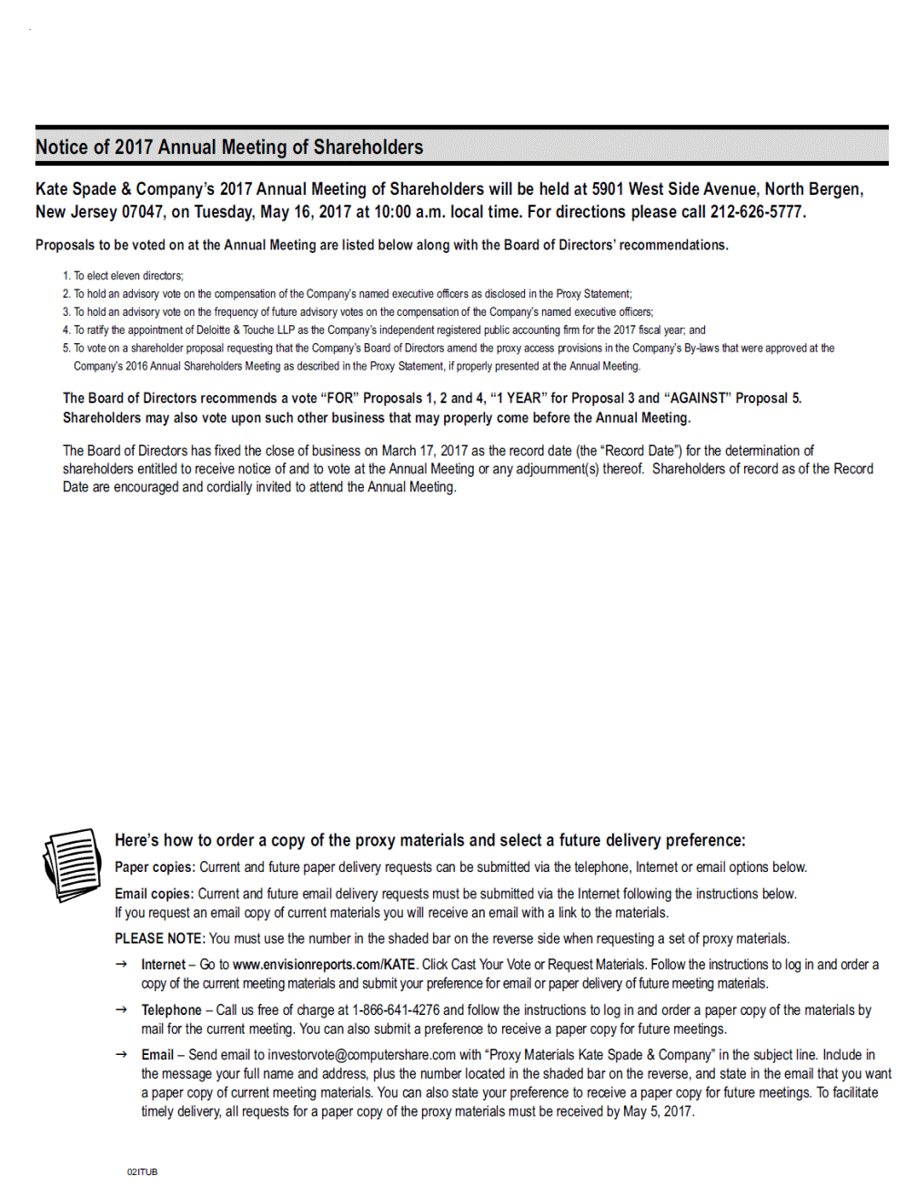 . Kate Spade & Company’s 2017 Annual Meeting of Shareholders will be held at 5901 West Side Avenue, North Bergen, New Jersey 07047, on Tuesday, May 16, 2017 at 10:00 a.m. local time. For directions please call 212-626-5777. Proposals to be voted on at the Annual Meeting are listed below along with the Board of Directors’ recommendations. 1. To elect eleven directors; 2. To hold an advisory vote on the compensation of the Company’s named executive officers as disclosed in the Proxy Statement; 3. To hold an advisory vote on the frequency of future advisory votes on the compensation of the Company’s named executive officers; 4. To ratify the appointment of Deloitte & Touche LLP as the Company’s independent registered public accounting firm for the 2017 fiscal year; and 5. To vote on a shareholder proposal requesting that the Company’s Board of Directors amend the proxy access provisions in the Company’s By-laws that were approved at the Company’s 2016 Annual Shareholders Meeting as described in the Proxy Statement, if properly presented at the Annual Meeting. The Board of Directors recommends a vote “FOR” Proposals 1, 2 and 4, “1 YEAR” for Proposal 3 and “AGAINST” Proposal 5. Shareholders may also vote upon such other business that may properly come before the Annual Meeting. The Board of Directors has fixed the close of business on March 17, 2017 as the record date (the “Record Date”) for the determination of shareholders entitled to receive notice of and to vote at the Annual Meeting or any adjournment(s) thereof. Shareholders of record as of the Record Date are encouraged and cordially invited to attend the Annual Meeting. Here’s how to order a copy of the proxy materials and select a future delivery preference: Paper copies: Current and future paper delivery requests can be submitted via the telephone, Internet or email options below. Email copies: Current and future email delivery requests must be submitted via the Internet following the instructions below. If you request an email copy of current materials you will receive an email with a link to the materials. PLEASE NOTE: You must use the number in the shaded bar on the reverse side when requesting a set of proxy materials. g Internet – Go to www.envisionreports.com/KATE. Click Cast Your Vote or Request Materials. Follow the instructions to log in and order a copy of the current meeting materials and submit your preference for email or paper delivery of future meeting materials. Telephone – Call us free of charge at 1-866-641-4276 and follow the instructions to log in and order a paper copy of the materials by mail for the current meeting. You can also submit a preference to receive a paper copy for future meetings. Email – Send email to investorvote@computershare.com with “Proxy Materials Kate Spade & Company” in the subject line. Include in the message your full name and address, plus the number located in the shaded bar on the reverse, and state in the email that you want a paper copy of current meeting materials. You can also state your preference to receive a paper copy for future meetings. To facilitate timely delivery, all requests for a paper copy of the proxy materials must be received by May 5, 2017. g g 02ITUB Notice of 2017 Annual Meeting of Shareholders