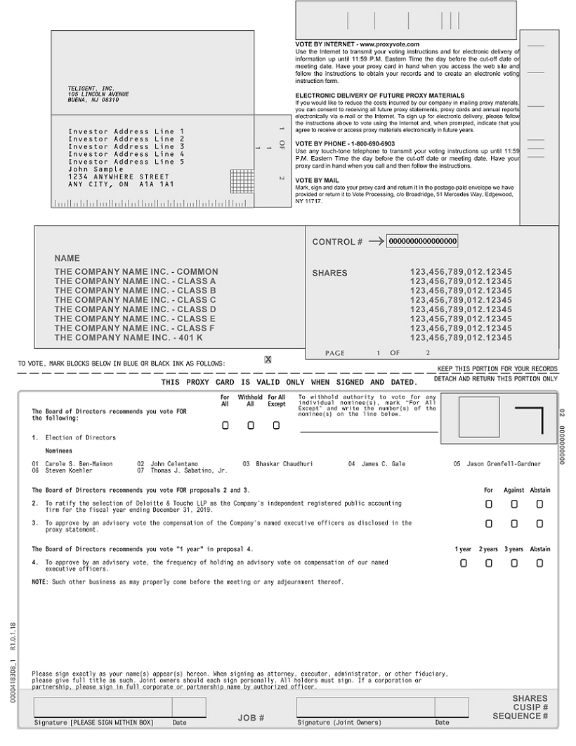 TELIGENT, INC. 105 LINCOLN AVENUE BUENA, NJ 08310 Investor Address Line 1 Investor Address Line 2 Investor Address Line 3 Investor Address Line 4 Investor Address Line 5 John Sample 1234 ANYWHERE STREET ANY CITY, ON A1A 1A1 2345678 1234567 2345678 1234567 2345678 1234567 234567 VOTE BY INTERNET - www.proxyvote.com Use the Internet to transmit your voting instructions and for electronic delivery of information up until 11:59 P.M. Eastern Time the day before the cut-off date or meeting date. Have your proxy card in hand when you access the web site and follow the instructions to obtain your records and to create an electronic voting instruction form. ELECTRONIC DELIVERY OF FUTURE PROXY MATERIALS If you would like to reduce the costs incurred by our company in mailing proxy materials, you can consent to receiving all future proxy statements, proxy cards and annual reports electronically via e-mail or the Internet. To sign up for electronic delivery, please follow the instructions above to vote using the Internet and, when prompted, indicate that you agree to receive or access proxy materials electronically in future years. VOTE BY PHONE - 1-800-690-6903 Use any touch-tone telephone to transmit your voting instructions up until 11:59 P.M. Eastern Time the day before the cut-off date or meeting date. Have your proxy card in hand when you call and then follow the instructions. VOTE BY MAIL Mark, sign and date your proxy card and return it in the postage-paid envelope we have provided or return it to Vote Processing, c/o Broadridge, 51 Mercedes Way, Edgewood, NY 11717. NAME THE COMPANY NAME INC. – COMMON CONTROL # → SHARES 123,456,789,012.12345 THE COMPANY NAME INC. - CLASS A 123,456,789,012.12345 THE COMPANY NAME INC. - CLASS B 123,456,789,012.12345 THE COMPANY NAME INC. - CLASS C 123,456,789,012.12345 THE COMPANY NAME INC. - CLASS D 123,456,789,012.12345 THE COMPANY NAME INC. - CLASS E 123,456,789,012.12345 THE COMPANY NAME INC. - CLASS F 123,456,789,012.12345 THE COMPA N Y NAME INC. - 401 K 123,456,789,012.12345 TO VOTE, MARK BLOCKS BELOW IN BLUE OR BLACK INK AS FOLLOWS: PAGE 1 OF 2 KEEP THIS PORTION FOR YOUR RECORDS THIS PROXY CARD IS VALID ONLY WHEN SIGNED AND DATED. DETACH AND RETURN THIS PORTION ONLY The Board of Directors recommends you vote FOR the following: For Withhold For All All All Except To withhold authority to vote for any individual nominee(s), mark “For All Except” and write the number(s) of the nominee(s) on the line below. 1. Election of Directors Nominees 0 0 0 01 Carole S. Ben-Maimon 02 John Celentano 03 Bhaskar Chaudhuri 04 James C. Gale 05 Jason Grenfell-Gardner 06 Steven Koehler 07 Thomas J. Sabatino, Jr. The Board of Directors recommends you vote FOR proposals 2 and 3. For Against Abstain 2. To ratify the selection of Deloitte & Touche LLP as the Company's independent registered public accounting firm for the fiscal year ending December 31, 2019. 3. To approve by an advisory vote the compensation of the Company's named executive officers as disclosed in the proxy statement. 0 0 00 0 0The Board of Directors recommends you vote "1 year" in proposal 4. 1 year 2 years 3 years Abstain 4. To approve by an advisory vote, the frequency of holding an advisory vote on compensation of our named executive officers. NOTE: Such other business as may properly come before the meeting or any adjournment thereof. Please sign exactly as your name(s) appear(s) hereon. When signing as attorney, executor, administrator, or other fiduciary, please give full title as such. Joint owners should each sign personally. All holders must sign. If a corporation or partnership, please sign in full corporate or partnership name by authorized officer. JOB # 0 0 0 0 SHARES CUSIP # SEQUENCE # Signature [PLEASE SIGN WITHIN BOX] Date Signature (Joint Owners) Date