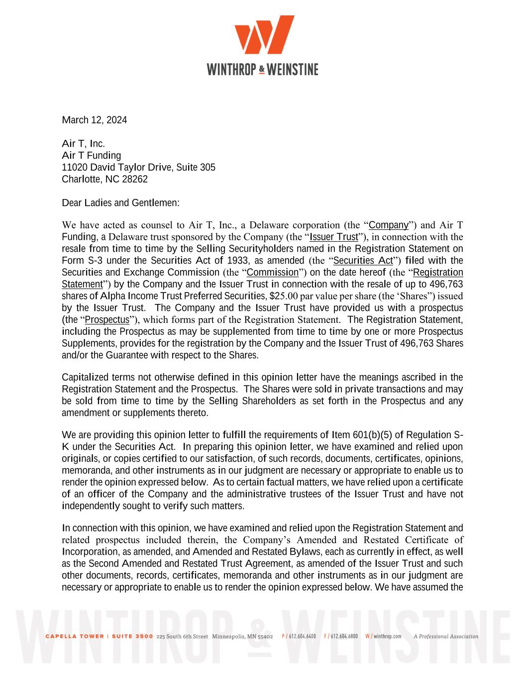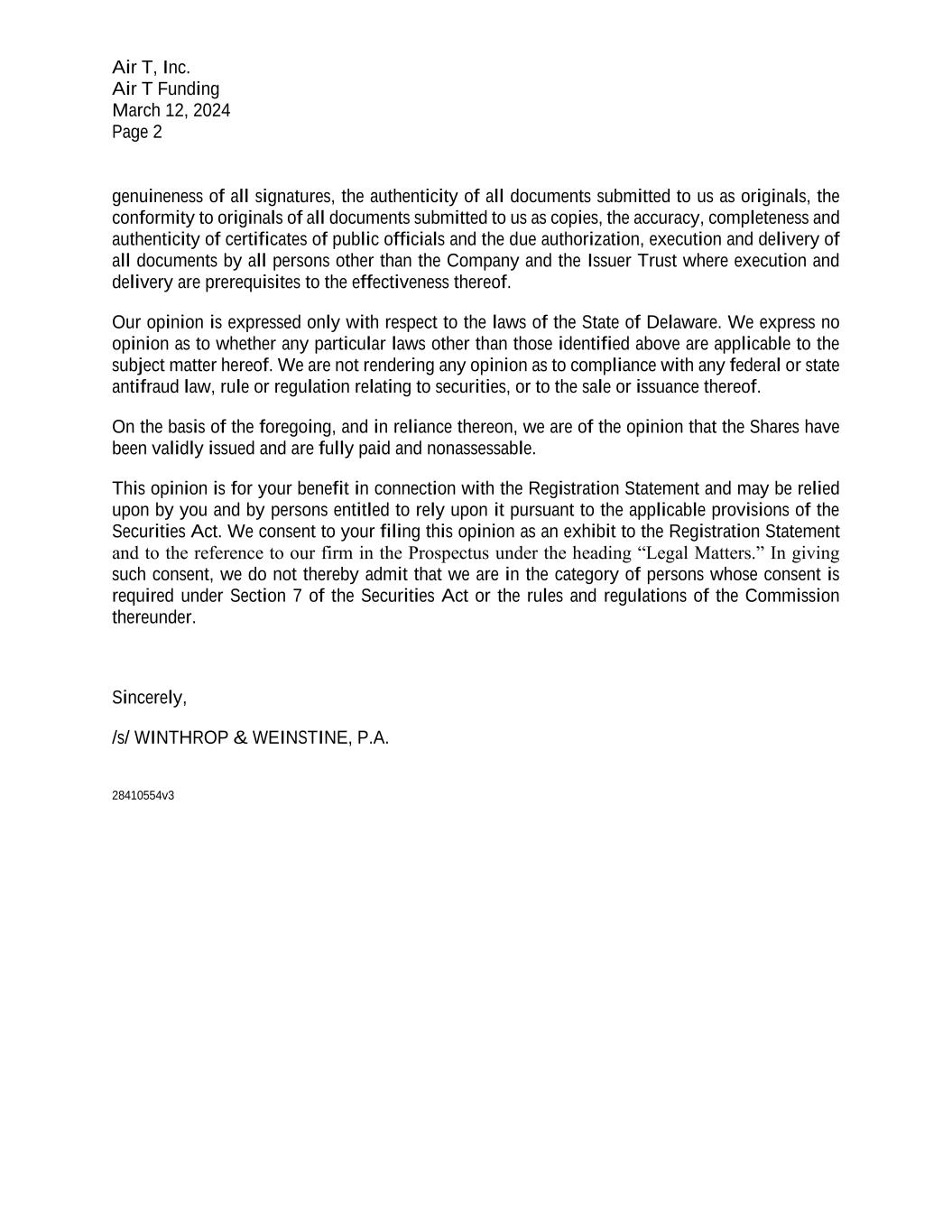 Air T, Inc. Air T Funding March 12, 2024 Page 2 genuineness of all signatures, the authenticity of all documents submitted to us as originals, the conformity to originals of all documents submitted to us as copies, the accuracy, completeness and authenticity of certificates of public officials and the due authorization, execution and delivery of all documents by all persons other than the Company and the Issuer Trust where execution and delivery are prerequisites to the effectiveness thereof. Our opinion is expressed only with respect to the laws of the State of Delaware. We express no opinion as to whether any particular laws other than those identified above are applicable to the subject matter hereof. We are not rendering any opinion as to compliance with any federal or state antifraud law, rule or regulation relating to securities, or to the sale or issuance thereof. On the basis of the foregoing, and in reliance thereon, we are of the opinion that the Shares have been validly issued and are fully paid and nonassessable. This opinion is for your benefit in connection with the Registration Statement and may be relied upon by you and by persons entitled to rely upon it pursuant to the applicable provisions of the Securities Act. We consent to your filing this opinion as an exhibit to the Registration Statement and to the reference to our firm in the Prospectus under the heading “Legal Matters.” In giving such consent, we do not thereby admit that we are in the category of persons whose consent is required under Section 7 of the Securities Act or the rules and regulations of the Commission thereunder. Sincerely, /s/ WINTHROP & WEINSTINE, P.A. 28410554v3