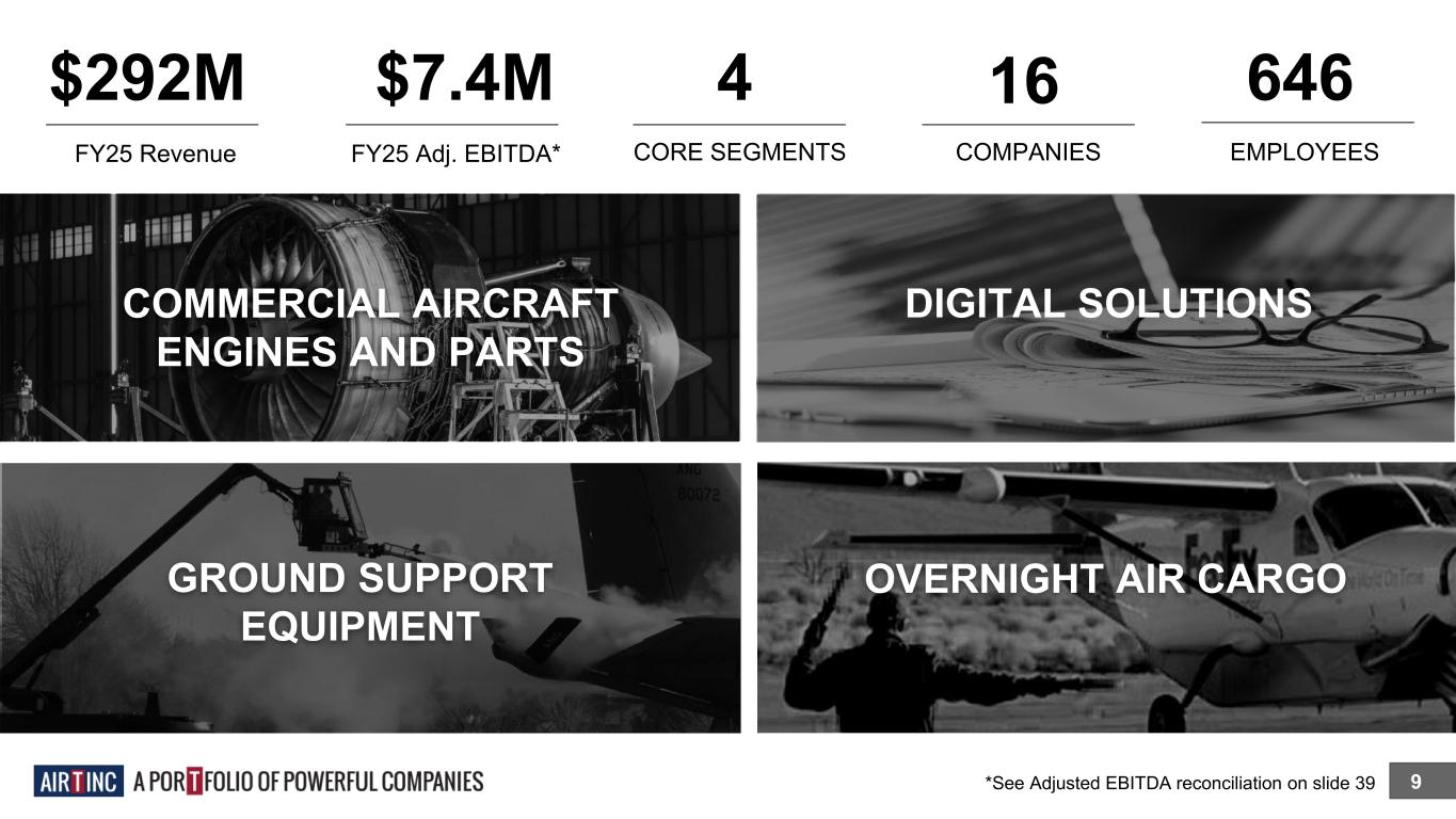 $292M 9 FY25 Revenue $7.4M FY25 Adj. EBITDA* 4 CORE SEGMENTS 16 COMPANIES 646 EMPLOYEES OVERNIGHT AIR CARGO COMMERCIAL AIRCRAFT ENGINES AND PARTS GROUND SUPPORT EQUIPMENT *See Adjusted EBITDA reconciliation on slide 39 DIGITAL SOLUTIONS
