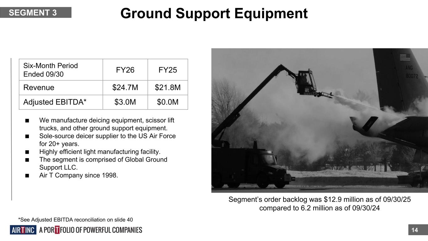 Overnight Air Cargo 13 SEGMENT 2 ■ We operate two of the nine FedEx feeder airlines in North America. ■ Business units Mountain Air Cargo and CSA Air have a 40+ year history with FedEx. ■ Air T Companies since 1982 and 1983 ■ Air T added recently acquired Royal Aviation Services (RAS) to this segment in FY26 Q1. An asset-light, predictable business. Six-Month Period Ended 09/30 FY26 FY25 Revenue $60.5M $61.6M Adjusted EBITDA* $3.4M $3.9M *See Adjusted EBITDA reconciliation on slide 40