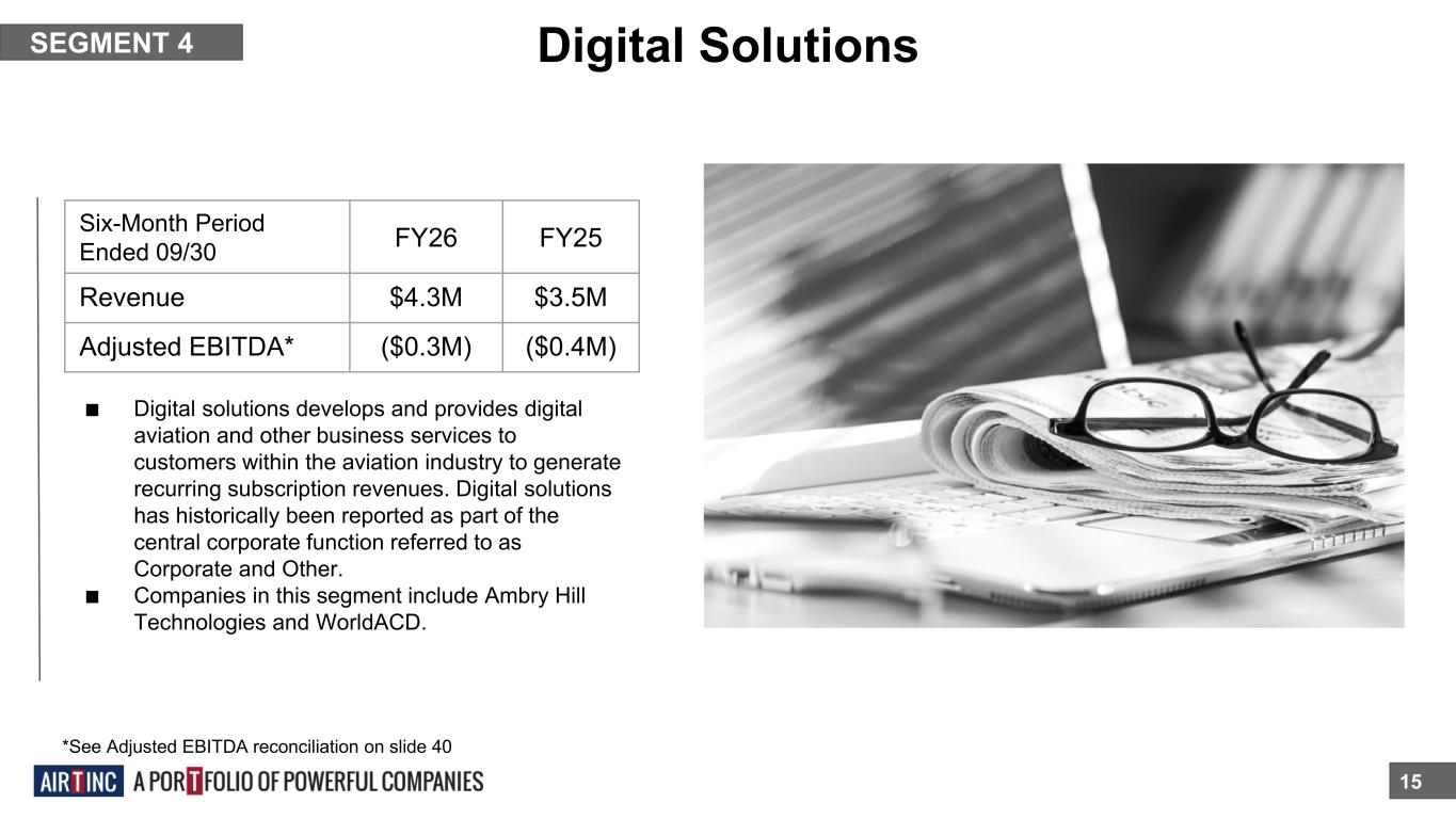 Ground Support Equipment 14 SEGMENT 3 ■ We manufacture deicing equipment, scissor lift trucks, and other ground support equipment. ■ Sole-source deicer supplier to the US Air Force for 20+ years. ■ Highly efficient light manufacturing facility. ■ The segment is comprised of Global Ground Support LLC. ■ Air T Company since 1998. Segment’s order backlog was $12.9 million as of 09/30/25 compared to 6.2 million as of 09/30/24 Six-Month Period Ended 09/30 FY26 FY25 Revenue $24.7M $21.8M Adjusted EBITDA* $3.0M $0.0M *See Adjusted EBITDA reconciliation on slide 40
