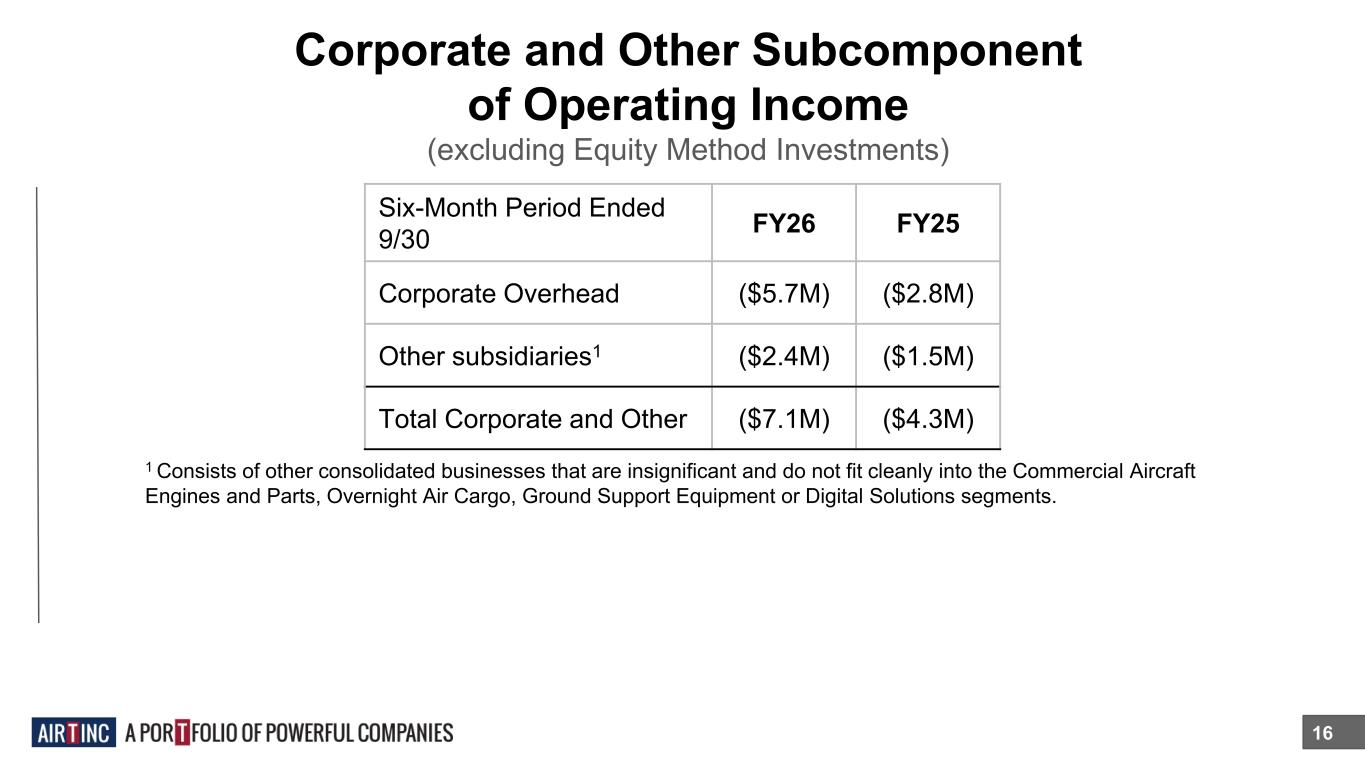 Digital Solutions 15 SEGMENT 4 ■ Digital solutions develops and provides digital aviation and other business services to customers within the aviation industry to generate recurring subscription revenues. Digital solutions has historically been reported as part of the central corporate function referred to as Corporate and Other. ■ Companies in this segment include Ambry Hill Technologies and WorldACD. Six-Month Period Ended 09/30 FY26 FY25 Revenue $4.3M $3.5M Adjusted EBITDA* ($0.3M) ($0.4M) *See Adjusted EBITDA reconciliation on slide 40