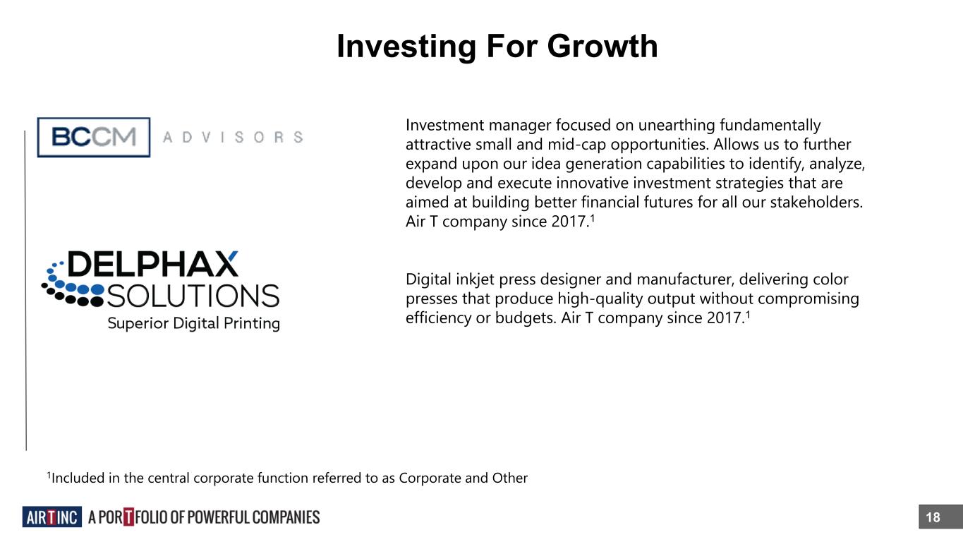 18 Investment manager focused on unearthing fundamentally attractive small and mid-cap opportunities. Allows us to further expand upon our idea generation capabilities to identify, analyze, develop and execute innovative investment strategies that are aimed at building better financial futures for all our stakeholders. Air T company since 2017.1 Digital inkjet press designer and manufacturer, delivering color presses that produce high-quality output without compromising efficiency or budgets. Air T company since 2017.1 Investing For Growth 1Included in the central corporate function referred to as Corporate and Other