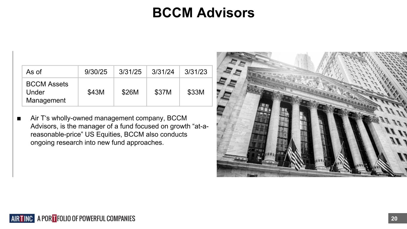 BCCM Advisors 20 ■ Air T‘s wholly-owned management company, BCCM Advisors, is the manager of a fund focused on growth “at-a- reasonable-price” US Equities, BCCM also conducts ongoing research into new fund approaches. As of 9/30/25 3/31/25 3/31/24 3/31/23 BCCM Assets Under Management $43M $26M $37M $33M