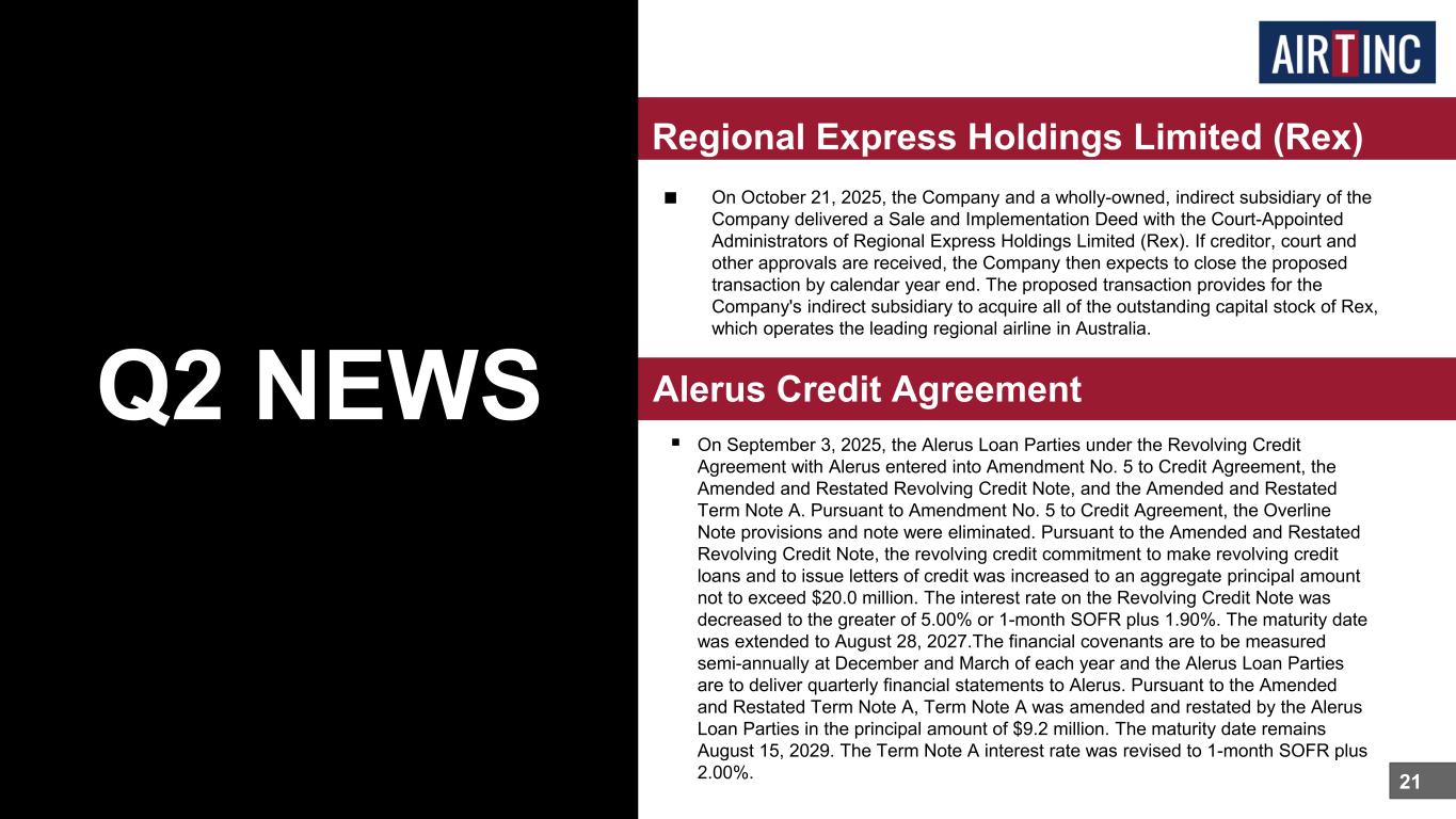 21 Q2 NEWS Regional Express Holdings Limited (Rex) ■ On October 21, 2025, the Company and a wholly-owned, indirect subsidiary of the Company delivered a Sale and Implementation Deed with the Court-Appointed Administrators of Regional Express Holdings Limited (Rex). If creditor, court and other approvals are received, the Company then expects to close the proposed transaction by calendar year end. The proposed transaction provides for the Company's indirect subsidiary to acquire all of the outstanding capital stock of Rex, which operates the leading regional airline in Australia. Alerus Credit Agreement ▪ On September 3, 2025, the Alerus Loan Parties under the Revolving Credit Agreement with Alerus entered into Amendment No. 5 to Credit Agreement, the Amended and Restated Revolving Credit Note, and the Amended and Restated Term Note A. Pursuant to Amendment No. 5 to Credit Agreement, the Overline Note provisions and note were eliminated. Pursuant to the Amended and Restated Revolving Credit Note, the revolving credit commitment to make revolving credit loans and to issue letters of credit was increased to an aggregate principal amount not to exceed $20.0 million. The interest rate on the Revolving Credit Note was decreased to the greater of 5.00% or 1-month SOFR plus 1.90%. The maturity date was extended to August 28, 2027.The financial covenants are to be measured semi-annually at December and March of each year and the Alerus Loan Parties are to deliver quarterly financial statements to Alerus. Pursuant to the Amended and Restated Term Note A, Term Note A was amended and restated by the Alerus Loan Parties in the principal amount of $9.2 million. The maturity date remains August 15, 2029. The Term Note A interest rate was revised to 1-month SOFR plus 2.00%.