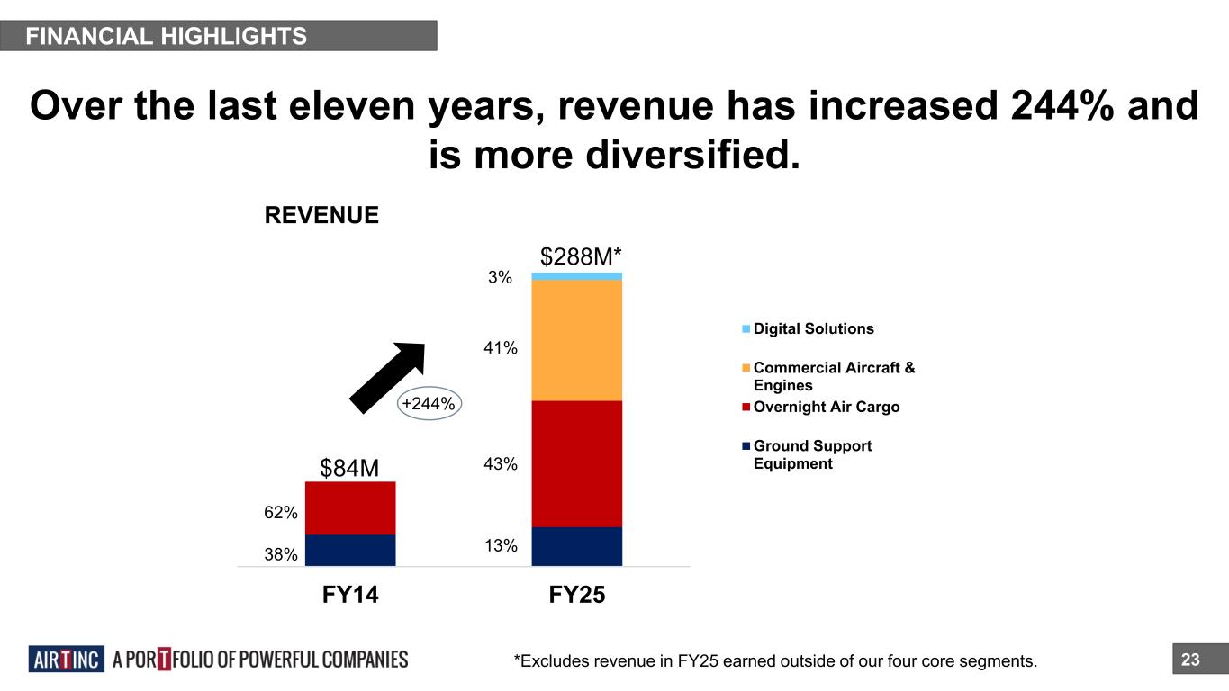 FINANCIAL HIGHLIGHTS Over the last eleven years, revenue has increased 244% and is more diversified. 23*Excludes revenue in FY25 earned outside of our four core segments. FY14 FY25 Digital Solutions Commercial Aircraft & Engines Overnight Air Cargo Ground Support Equipment 62% 38% 13% 43% 41% 3% +244% REVENUE $84M $288M*