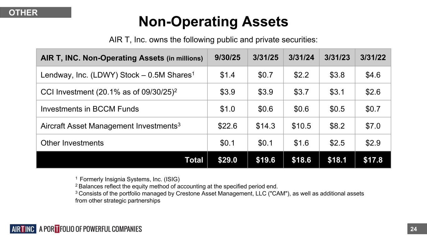 Non-Operating Assets 24 AIR T, Inc. owns the following public and private securities: OTHER AIR T, INC. Non-Operating Assets (in millions) 9/30/25 3/31/25 3/31/24 3/31/23 3/31/22 Lendway, Inc. (LDWY) Stock – 0.5M Shares1 $1.4 $0.7 $2.2 $3.8 $4.6 CCI Investment (20.1% as of 09/30/25)2 $3.9 $3.9 $3.7 $3.1 $2.6 Investments in BCCM Funds $1.0 $0.6 $0.6 $0.5 $0.7 Aircraft Asset Management Investments3 $22.6 $14.3 $10.5 $8.2 $7.0 Other Investments $0.1 $0.1 $1.6 $2.5 $2.9 Total $29.0 $19.6 $18.6 $18.1 $17.8 1 Formerly Insignia Systems, Inc. (ISIG) 2 Balances reflect the equity method of accounting at the specified period end. 3 Consists of the portfolio managed by Crestone Asset Management, LLC ("CAM"), as well as additional assets from other strategic partnerships