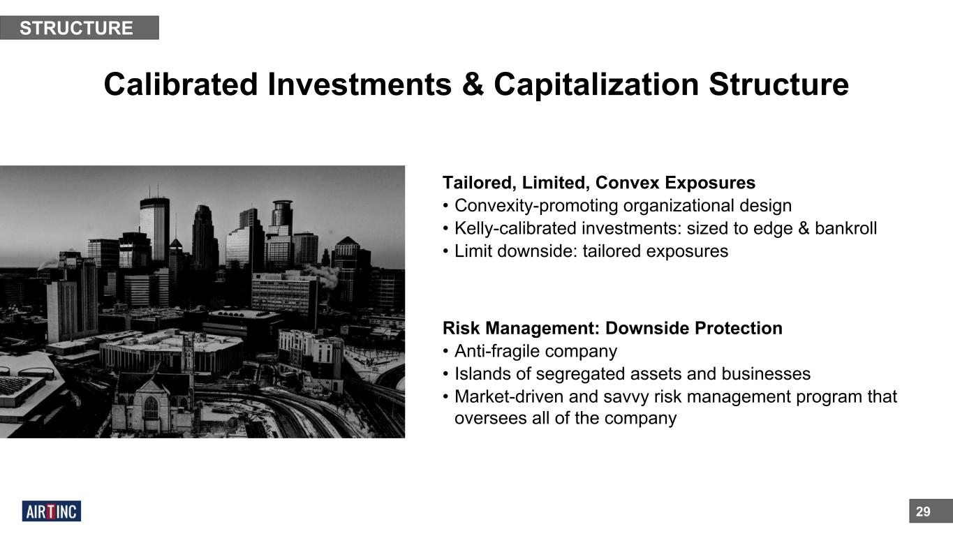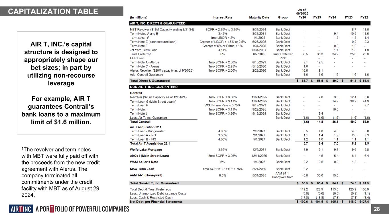 28 CAPITALIZATION TABLE AIR T, INC.’s capital structure is designed to appropriately shape our bet sizes; in part by utilizing non-recourse leverage For example, AIR T guarantees Contrail’s bank loans to a maximum limit of $1.6 million. 1The revolver and term notes with MBT were fully paid off with the proceeds from the new credit agreement with Alerus. The company terminated all commitments under the credit facility with MBT as of August 29, 2024.