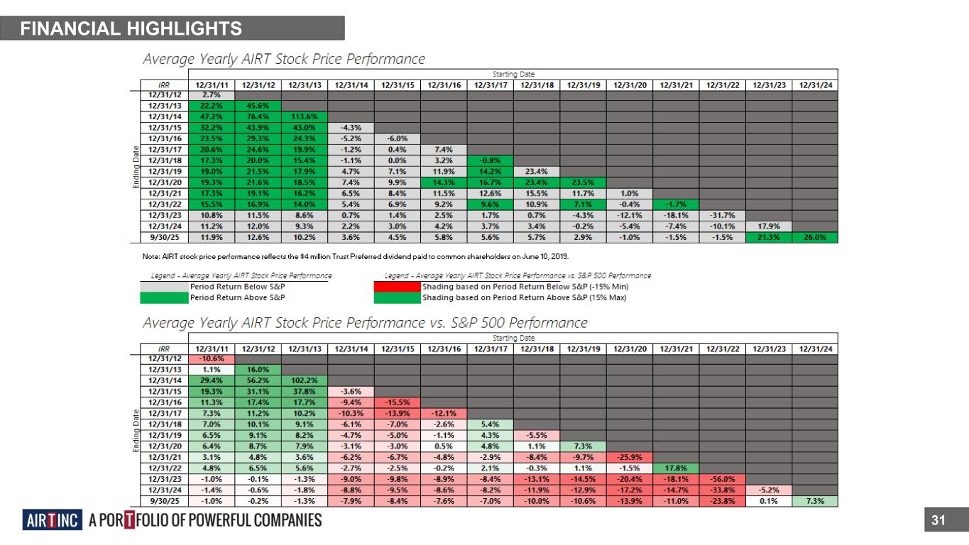 FINANCIAL HIGHLIGHTS 30 *Reporting period 9/30/13 to 9/30/25, includes $4M Trust Preferred dividend to common shareholders, paid August 12, 2022. + Compares to 12.2% return of the S&P 500 over the same period $23.72 Since 12/31/2013, the share price of AIRT has increased by 10.7% per annum*+.