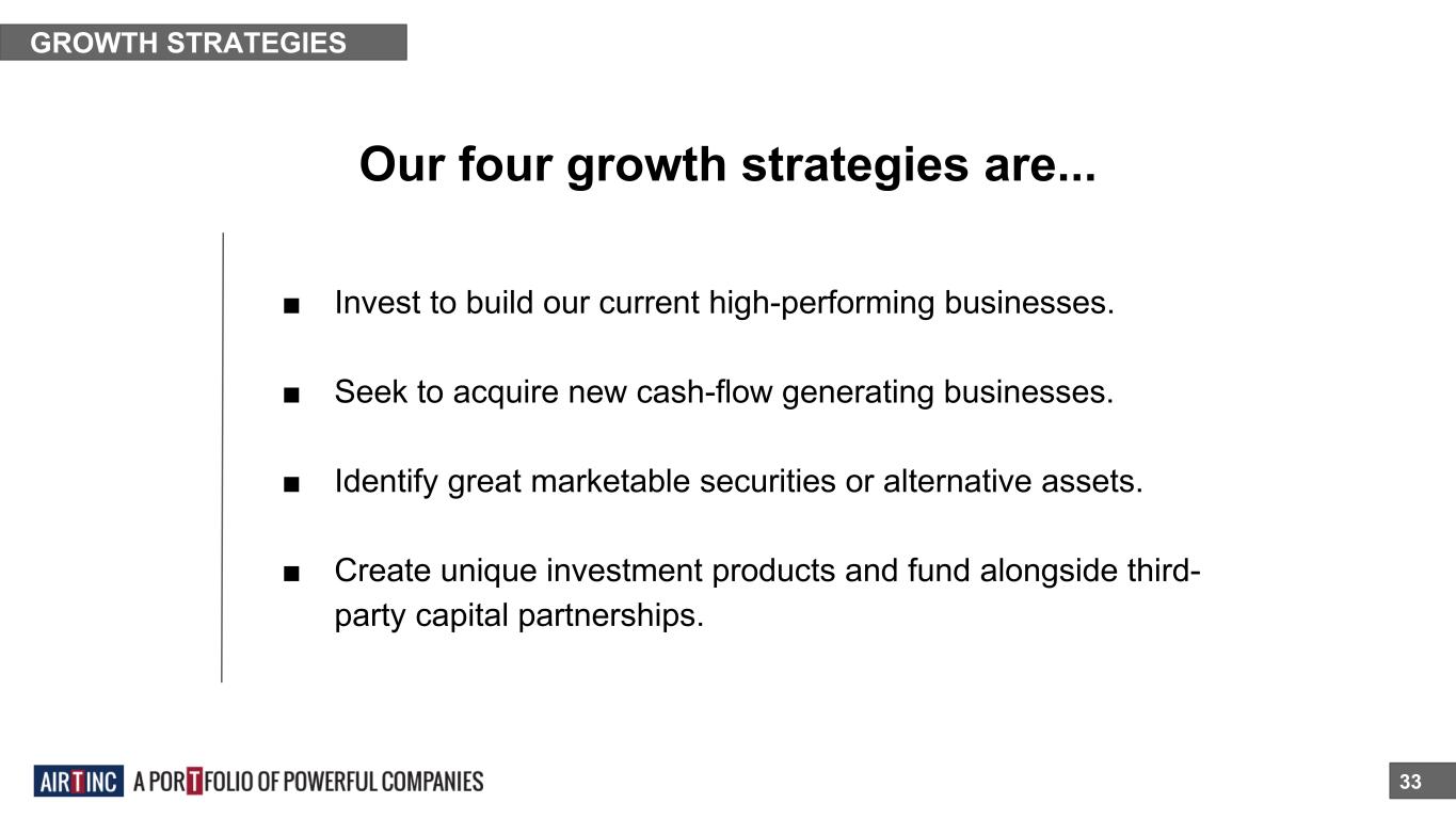 GROWTH STRATEGIES Our four growth strategies are... 33 ■ Invest to build our current high-performing businesses. ■ Seek to acquire new cash-flow generating businesses. ■ Identify great marketable securities or alternative assets. ■ Create unique investment products and fund alongside third- party capital partnerships.