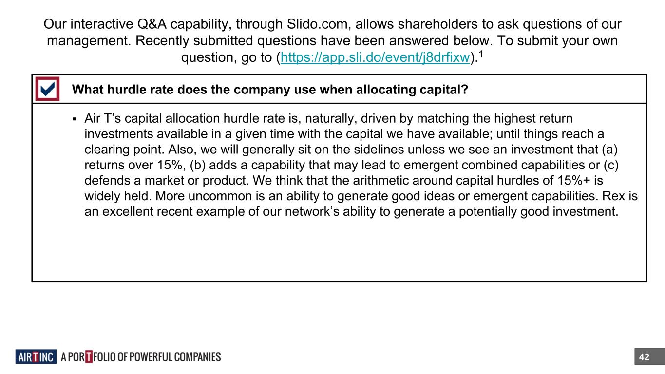 Our interactive Q&A capability, through Slido.com, allows shareholders to ask questions of our management. Recently submitted questions have been answered below. To submit your own question, go to (https://app.sli.do/event/j8drfixw).1 42 What hurdle rate does the company use when allocating capital? ▪ Air T’s capital allocation hurdle rate is, naturally, driven by matching the highest return investments available in a given time with the capital we have available; until things reach a clearing point. Also, we will generally sit on the sidelines unless we see an investment that (a) returns over 15%, (b) adds a capability that may lead to emergent combined capabilities or (c) defends a market or product. We think that the arithmetic around capital hurdles of 15%+ is widely held. More uncommon is an ability to generate good ideas or emergent capabilities. Rex is an excellent recent example of our network’s ability to generate a potentially good investment.