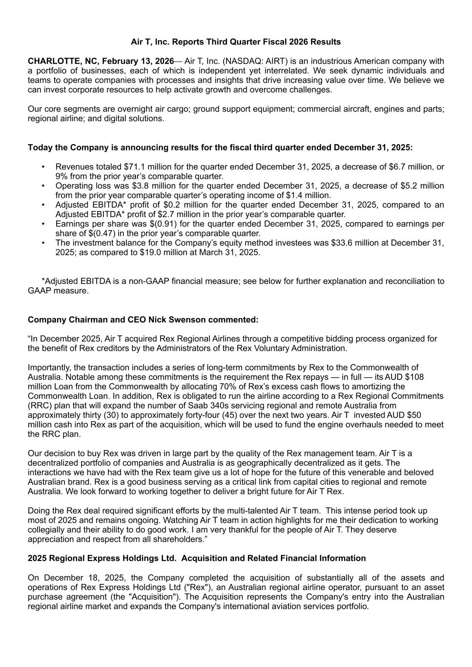 Air T, Inc. Reports Third Quarter Fiscal 2026 Results CHARLOTTE, NC, February 13, 2026— Air T, Inc. (NASDAQ: AIRT) is an industrious American company with a portfolio of businesses, each of which is independent yet interrelated. We seek dynamic individuals and teams to operate companies with processes and insights that drive increasing value over time. We believe we can invest corporate resources to help activate growth and overcome challenges. Our core segments are overnight air cargo; ground support equipment; commercial aircraft, engines and parts; regional airline; and digital solutions. Today the Company is announcing results for the fiscal third quarter ended December 31, 2025: • Revenues totaled $71.1 million for the quarter ended December 31, 2025, a decrease of $6.7 million, or 9% from the prior year’s comparable quarter. • Operating loss was $3.8 million for the quarter ended December 31, 2025, a decrease of $5.2 million from the prior year comparable quarter’s operating income of $1.4 million. • Adjusted EBITDA* profit of $0.2 million for the quarter ended December 31, 2025, compared to an Adjusted EBITDA* profit of $2.7 million in the prior year’s comparable quarter. • Earnings per share was $(0.91) for the quarter ended December 31, 2025, compared to earnings per share of $(0.47) in the prior year’s comparable quarter. • The investment balance for the Company’s equity method investees was $33.6 million at December 31, 2025; as compared to $19.0 million at March 31, 2025. *Adjusted EBITDA is a non-GAAP financial measure; see below for further explanation and reconciliation to GAAP measure. Company Chairman and CEO Nick Swenson commented: “In December 2025, Air T acquired Rex Regional Airlines through a competitive bidding process organized for the benefit of Rex creditors by the Administrators of the Rex Voluntary Administration. Importantly, the transaction includes a series of long-term commitments by Rex to the Commonwealth of Australia. Notable among these commitments is the requirement the Rex repays — in full — its AUD $108 million Loan from the Commonwealth by allocating 70% of Rex’s excess cash flows to amortizing the Commonwealth Loan. In addition, Rex is obligated to run the airline according to a Rex Regional Commitments (RRC) plan that will expand the number of Saab 340s servicing regional and remote Australia from approximately thirty (30) to approximately forty-four (45) over the next two years. Air T invested AUD $50 million cash into Rex as part of the acquisition, which will be used to fund the engine overhauls needed to meet the RRC plan. Our decision to buy Rex was driven in large part by the quality of the Rex management team. Air T is a decentralized portfolio of companies and Australia is as geographically decentralized as it gets. The interactions we have had with the Rex team give us a lot of hope for the future of this venerable and beloved Australian brand. Rex is a good business serving as a critical link from capital cities to regional and remote Australia. We look forward to working together to deliver a bright future for Air T Rex. Doing the Rex deal required significant efforts by the multi-talented Air T team. This intense period took up most of 2025 and remains ongoing. Watching Air T team in action highlights for me their dedication to working collegially and their ability to do good work. I am very thankful for the people of Air T. They deserve appreciation and respect from all shareholders.” 2025 Regional Express Holdings Ltd. Acquisition and Related Financial Information On December 18, 2025, the Company completed the acquisition of substantially all of the assets and operations of Rex Express Holdings Ltd ("Rex"), an Australian regional airline operator, pursuant to an asset purchase agreement (the "Acquisition"). The Acquisition represents the Company's entry into the Australian regional airline market and expands the Company's international aviation services portfolio.