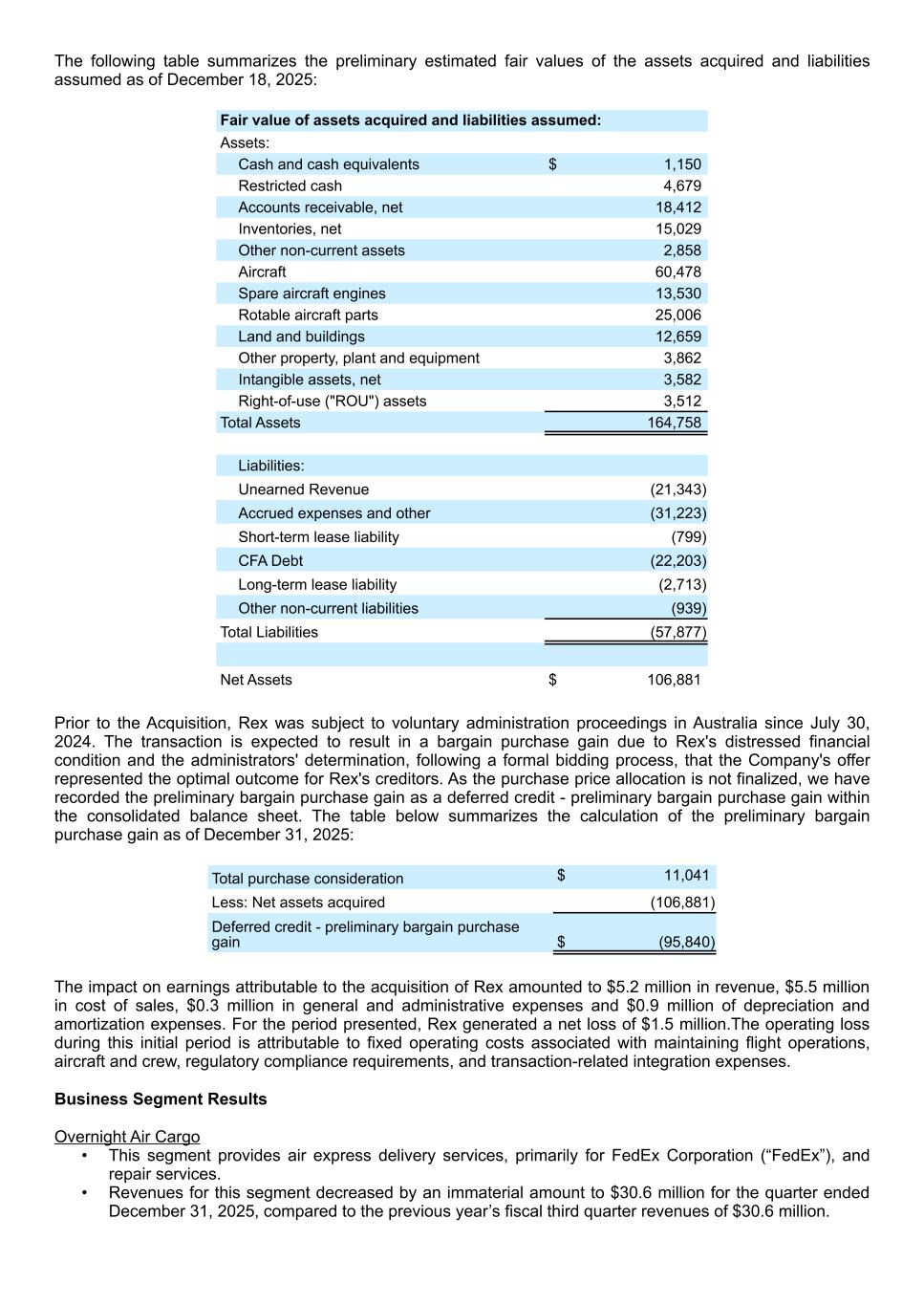 The following table summarizes the preliminary estimated fair values of the assets acquired and liabilities assumed as of December 18, 2025: Fair value of assets acquired and liabilities assumed: Assets: Cash and cash equivalents $ 1,150 Restricted cash 4,679 Accounts receivable, net 18,412 Inventories, net 15,029 Other non-current assets 2,858 Aircraft 60,478 Spare aircraft engines 13,530 Rotable aircraft parts 25,006 Land and buildings 12,659 Other property, plant and equipment 3,862 Intangible assets, net 3,582 Right-of-use ("ROU") assets 3,512 Total Assets 164,758 Liabilities: Unearned Revenue (21,343) Accrued expenses and other (31,223) Short-term lease liability (799) CFA Debt (22,203) Long-term lease liability (2,713) Other non-current liabilities (939) Total Liabilities (57,877) Net Assets $ 106,881 Prior to the Acquisition, Rex was subject to voluntary administration proceedings in Australia since July 30, 2024. The transaction is expected to result in a bargain purchase gain due to Rex's distressed financial condition and the administrators' determination, following a formal bidding process, that the Company's offer represented the optimal outcome for Rex's creditors. As the purchase price allocation is not finalized, we have recorded the preliminary bargain purchase gain as a deferred credit - preliminary bargain purchase gain within the consolidated balance sheet. The table below summarizes the calculation of the preliminary bargain purchase gain as of December 31, 2025: Total purchase consideration $ 11,041 Less: Net assets acquired (106,881) Deferred credit - preliminary bargain purchase gain $ (95,840) The impact on earnings attributable to the acquisition of Rex amounted to $5.2 million in revenue, $5.5 million in cost of sales, $0.3 million in general and administrative expenses and $0.9 million of depreciation and amortization expenses. For the period presented, Rex generated a net loss of $1.5 million.The operating loss during this initial period is attributable to fixed operating costs associated with maintaining flight operations, aircraft and crew, regulatory compliance requirements, and transaction-related integration expenses. Business Segment Results Overnight Air Cargo • This segment provides air express delivery services, primarily for FedEx Corporation (“FedEx”), and repair services. • Revenues for this segment decreased by an immaterial amount to $30.6 million for the quarter ended December 31, 2025, compared to the previous year’s fiscal third quarter revenues of $30.6 million.