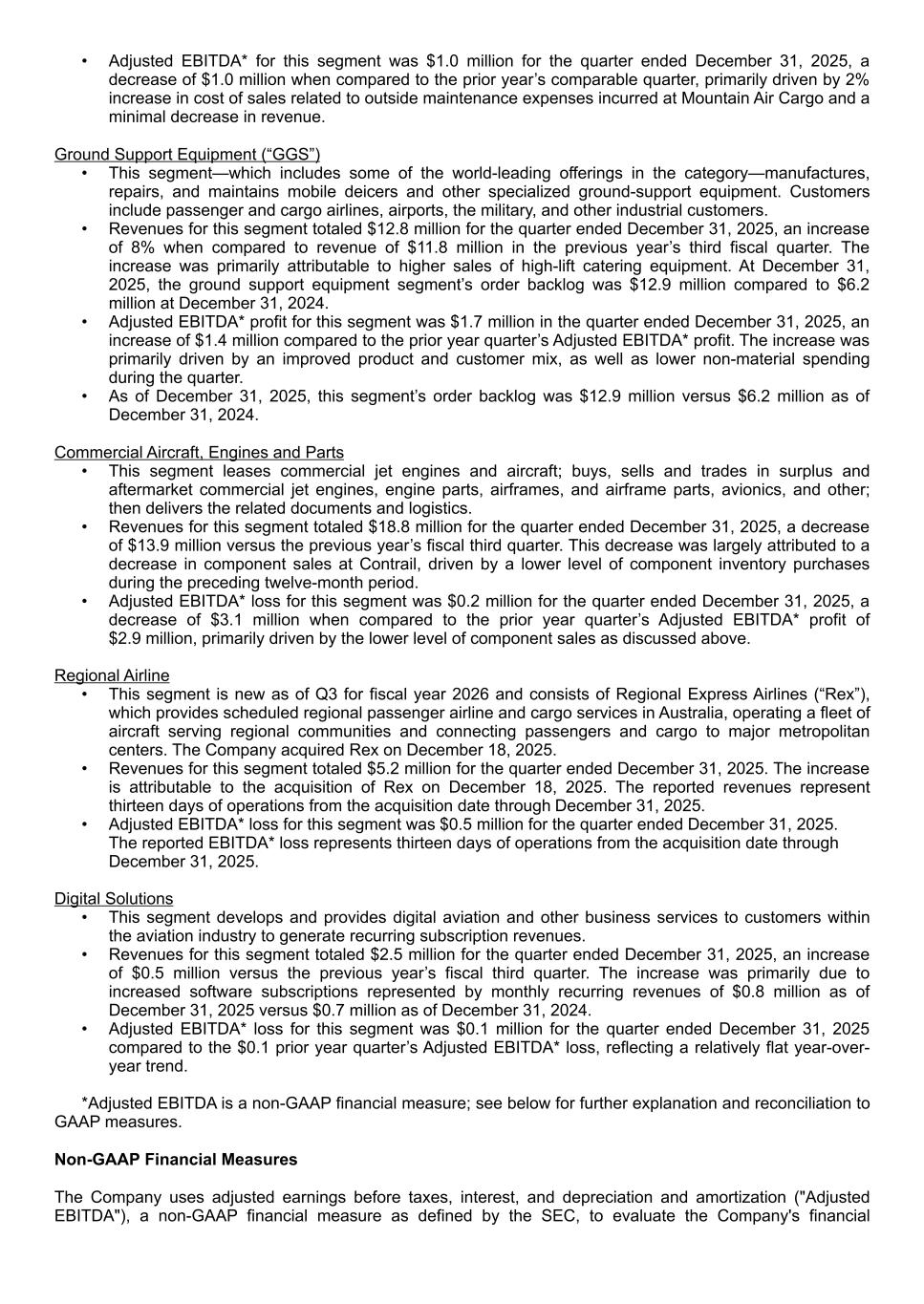 • Adjusted EBITDA* for this segment was $1.0 million for the quarter ended December 31, 2025, a decrease of $1.0 million when compared to the prior year’s comparable quarter, primarily driven by 2% increase in cost of sales related to outside maintenance expenses incurred at Mountain Air Cargo and a minimal decrease in revenue. Ground Support Equipment (“GGS”) • This segment—which includes some of the world-leading offerings in the category—manufactures, repairs, and maintains mobile deicers and other specialized ground-support equipment. Customers include passenger and cargo airlines, airports, the military, and other industrial customers. • Revenues for this segment totaled $12.8 million for the quarter ended December 31, 2025, an increase of 8% when compared to revenue of $11.8 million in the previous year’s third fiscal quarter. The increase was primarily attributable to higher sales of high-lift catering equipment. At December 31, 2025, the ground support equipment segment’s order backlog was $12.9 million compared to $6.2 million at December 31, 2024. • Adjusted EBITDA* profit for this segment was $1.7 million in the quarter ended December 31, 2025, an increase of $1.4 million compared to the prior year quarter’s Adjusted EBITDA* profit. The increase was primarily driven by an improved product and customer mix, as well as lower non-material spending during the quarter. • As of December 31, 2025, this segment’s order backlog was $12.9 million versus $6.2 million as of December 31, 2024. Commercial Aircraft, Engines and Parts • This segment leases commercial jet engines and aircraft; buys, sells and trades in surplus and aftermarket commercial jet engines, engine parts, airframes, and airframe parts, avionics, and other; then delivers the related documents and logistics. • Revenues for this segment totaled $18.8 million for the quarter ended December 31, 2025, a decrease of $13.9 million versus the previous year’s fiscal third quarter. This decrease was largely attributed to a decrease in component sales at Contrail, driven by a lower level of component inventory purchases during the preceding twelve-month period. • Adjusted EBITDA* loss for this segment was $0.2 million for the quarter ended December 31, 2025, a decrease of $3.1 million when compared to the prior year quarter’s Adjusted EBITDA* profit of $2.9 million, primarily driven by the lower level of component sales as discussed above. Regional Airline • This segment is new as of Q3 for fiscal year 2026 and consists of Regional Express Airlines (“Rex”), which provides scheduled regional passenger airline and cargo services in Australia, operating a fleet of aircraft serving regional communities and connecting passengers and cargo to major metropolitan centers. The Company acquired Rex on December 18, 2025. • Revenues for this segment totaled $5.2 million for the quarter ended December 31, 2025. The increase is attributable to the acquisition of Rex on December 18, 2025. The reported revenues represent thirteen days of operations from the acquisition date through December 31, 2025. • Adjusted EBITDA* loss for this segment was $0.5 million for the quarter ended December 31, 2025. The reported EBITDA* loss represents thirteen days of operations from the acquisition date through December 31, 2025. Digital Solutions • This segment develops and provides digital aviation and other business services to customers within the aviation industry to generate recurring subscription revenues. • Revenues for this segment totaled $2.5 million for the quarter ended December 31, 2025, an increase of $0.5 million versus the previous year’s fiscal third quarter. The increase was primarily due to increased software subscriptions represented by monthly recurring revenues of $0.8 million as of December 31, 2025 versus $0.7 million as of December 31, 2024. • Adjusted EBITDA* loss for this segment was $0.1 million for the quarter ended December 31, 2025 compared to the $0.1 prior year quarter’s Adjusted EBITDA* loss, reflecting a relatively flat year-over- year trend. *Adjusted EBITDA is a non-GAAP financial measure; see below for further explanation and reconciliation to GAAP measures. Non-GAAP Financial Measures The Company uses adjusted earnings before taxes, interest, and depreciation and amortization ("Adjusted EBITDA"), a non-GAAP financial measure as defined by the SEC, to evaluate the Company's financial