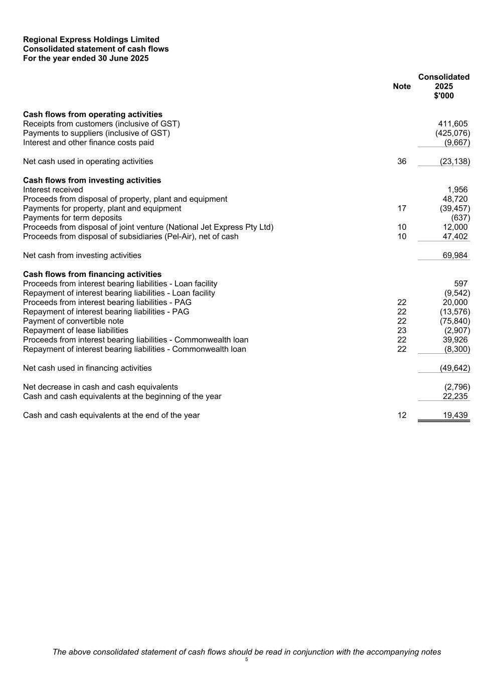 Regional Express Holdings Limited Consolidated statement of cash flows For the year ended 30 June 2025 Consolidated Note 2025 $'000 The above consolidated statement of cash flows should be read in conjunction with the accompanying notes 5 Cash flows from operating activities Receipts from customers (inclusive of GST) 411,605 Payments to suppliers (inclusive of GST) (425,076) Interest and other finance costs paid (9,667) Net cash used in operating activities 36 (23,138) Cash flows from investing activities Interest received 1,956 Proceeds from disposal of property, plant and equipment 48,720 Payments for property, plant and equipment 17 (39,457) Payments for term deposits (637) Proceeds from disposal of joint venture (National Jet Express Pty Ltd) 10 12,000 Proceeds from disposal of subsidiaries (Pel-Air), net of cash 10 47,402 Net cash from investing activities 69,984 Cash flows from financing activities Proceeds from interest bearing liabilities - Loan facility 597 Repayment of interest bearing liabilities - Loan facility (9,542) Proceeds from interest bearing liabilities - PAG 22 20,000 Repayment of interest bearing liabilities - PAG 22 (13,576) Payment of convertible note 22 (75,840) Repayment of lease liabilities 23 (2,907) Proceeds from interest bearing liabilities - Commonwealth loan 22 39,926 Repayment of interest bearing liabilities - Commonwealth loan 22 (8,300) Net cash used in financing activities (49,642) Net decrease in cash and cash equivalents (2,796) Cash and cash equivalents at the beginning of the year 22,235 Cash and cash equivalents at the end of the year 12 19,439