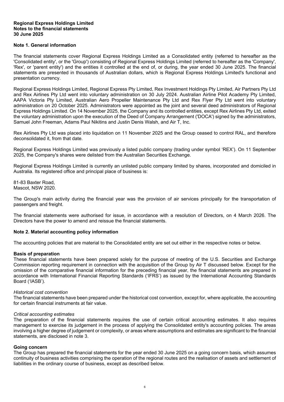 Regional Express Holdings Limited Notes to the financial statements 30 June 2025 6 Note 1. General information The financial statements cover Regional Express Holdings Limited as a Consolidated entity (referred to hereafter as the 'Consolidated entity', or the 'Group') consisting of Regional Express Holdings Limited (referred to hereafter as the 'Company', 'Rex', or 'parent entity') and the entities it controlled at the end of, or during, the year ended 30 June 2025. The financial statements are presented in thousands of Australian dollars, which is Regional Express Holdings Limited's functional and presentation currency. Regional Express Holdings Limited, Regional Express Pty Limited, Rex Investment Holdings Pty Limited, Air Partners Pty Ltd and Rex Airlines Pty Ltd went into voluntary administration on 30 July 2024. Australian Airline Pilot Academy Pty Limited, AAPA Victoria Pty Limited, Australian Aero Propeller Maintenance Pty Ltd and Rex Flyer Pty Ltd went into voluntary administration on 20 October 2025. Administrators were appointed as the joint and several deed administrators of Regional Express Holdings Limited. On 14 November 2025, the Company and its controlled entities, except Rex Airlines Pty Ltd, exited the voluntary administration upon the execution of the Deed of Company Arrangement ('DOCA') signed by the administrators, Samuel John Freeman, Adams Paul Nikitins and Justin Denis Walsh, and Air T, Inc. Rex Airlines Pty Ltd was placed into liquidation on 11 November 2025 and the Group ceased to control RAL, and therefore deconsolidated it, from that date. Regional Express Holdings Limited was previously a listed public company (trading under symbol ‘REX’). On 11 September 2025, the Company's shares were delisted from the Australian Securities Exchange. Regional Express Holdings Limited is currently an unlisted public company limited by shares, incorporated and domiciled in Australia. Its registered office and principal place of business is: 81-83 Baxter Road, Mascot, NSW 2020. The Group's main activity during the financial year was the provision of air services principally for the transportation of passengers and freight. The financial statements were authorised for issue, in accordance with a resolution of Directors, on 4 March 2026. The Directors have the power to amend and reissue the financial statements. Note 2. Material accounting policy information The accounting policies that are material to the Consolidated entity are set out either in the respective notes or below. Basis of preparation These financial statements have been prepared solely for the purpose of meeting of the U.S. Securities and Exchange Commission reporting requirement in connection with the acquisition of the Group by Air T discussed below. Except for the omission of the comparative financial information for the preceding financial year, the financial statements are prepared in accordance with International Financial Reporting Standards (‘IFRS’) as issued by the International Accounting Standards Board (‘IASB’). Historical cost convention The financial statements have been prepared under the historical cost convention, except for, where applicable, the accounting for certain financial instruments at fair value. Critical accounting estimates The preparation of the financial statements requires the use of certain critical accounting estimates. It also requires management to exercise its judgement in the process of applying the Consolidated entity's accounting policies. The areas involving a higher degree of judgement or complexity, or areas where assumptions and estimates are significant to the financial statements, are disclosed in note 3. Going concern The Group has prepared the financial statements for the year ended 30 June 2025 on a going concern basis, which assumes continuity of business activities comprising the operation of the regional routes and the realisation of assets and settlement of liabilities in the ordinary course of business, except as described below.