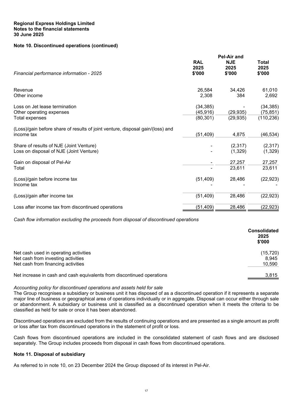 Regional Express Holdings Limited Notes to the financial statements 30 June 2025 Note 10. Discontinued operations (continued) 17 RAL Pel-Air and NJE Total 2025 2025 2025 Financial performance information - 2025 $'000 $'000 $'000 Revenue 26,584 34,426 61,010 Other income 2,308 384 2,692 Loss on Jet lease termination (34,385) - (34,385) Other operating expenses (45,916) (29,935) (75,851) Total expenses (80,301) (29,935) (110,236) (Loss)/gain before share of results of joint venture, disposal gain/(loss) and income tax (51,409) 4,875 (46,534) Share of results of NJE (Joint Venture) - (2,317) (2,317) Loss on disposal of NJE (Joint Venture) - (1,329) (1,329) Gain on disposal of Pel-Air - 27,257 27,257 Total - 23,611 23,611 (Loss)/gain before income tax (51,409) 28,486 (22,923) Income tax - - - (Loss)/gain after income tax (51,409) 28,486 (22,923) Loss after income tax from discontinued operations (51,409) 28,486 (22,923) Cash flow information excluding the proceeds from disposal of discontinued operations Consolidated 2025 $'000 Net cash used in operating activities (15,720) Net cash from investing activities 8,945 Net cash from financing activities 10,590 Net increase in cash and cash equivalents from discontinued operations 3,815 Accounting policy for discontinued operations and assets held for sale The Group recognises a subsidiary or business unit it has disposed of as a discontinued operation if it represents a separate major line of business or geographical area of operations individually or in aggregate. Disposal can occur either through sale or abandonment. A subsidiary or business unit is classified as a discontinued operation when it meets the criteria to be classified as held for sale or once it has been abandoned. Discontinued operations are excluded from the results of continuing operations and are presented as a single amount as profit or loss after tax from discontinued operations in the statement of profit or loss. Cash flows from discontinued operations are included in the consolidated statement of cash flows and are disclosed separately. The Group includes proceeds from disposal in cash flows from discontinued operations. Note 11. Disposal of subsidiary As referred to in note 10, on 23 December 2024 the Group disposed of its interest in Pel-Air.