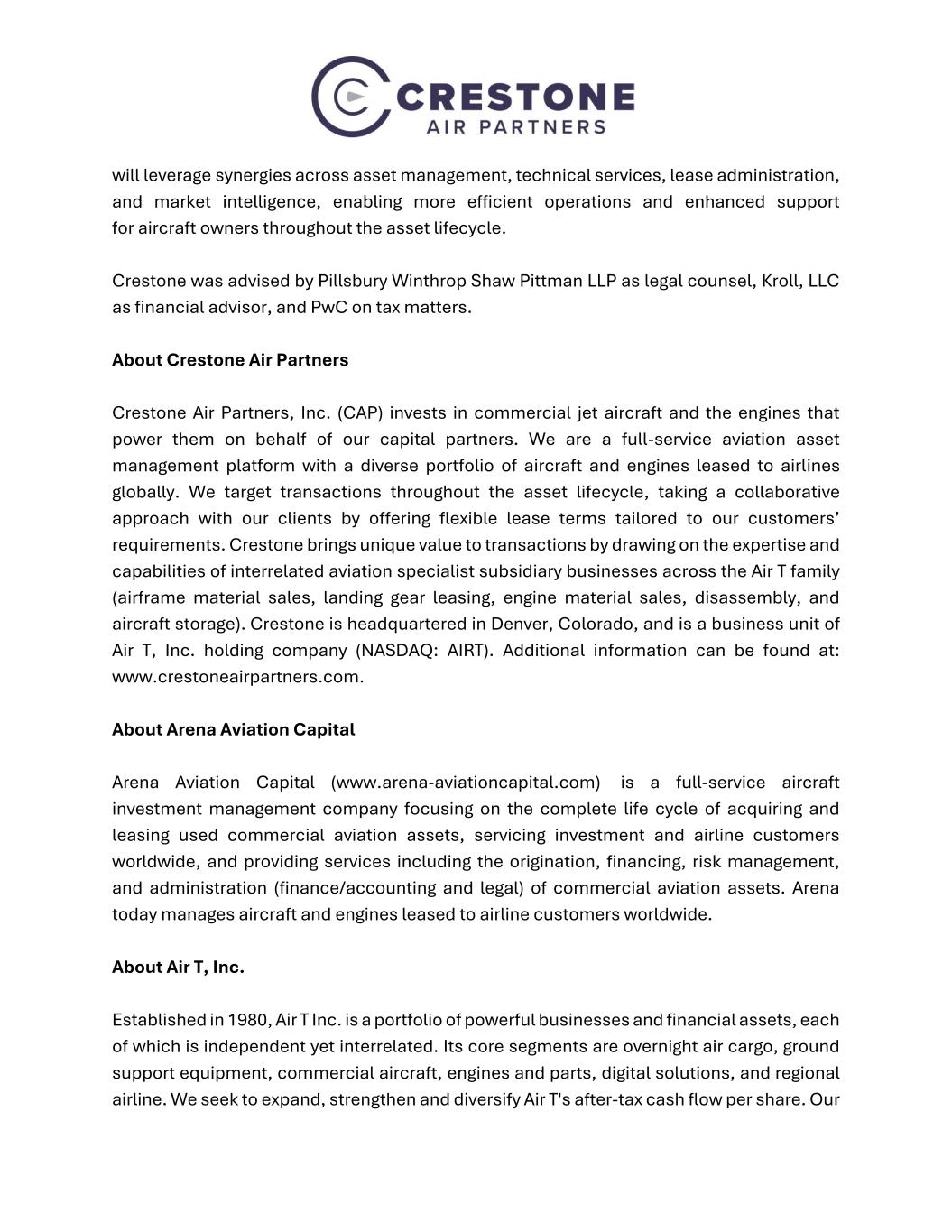 will leverage synergies across asset management, technical services, lease administration, and market intelligence, enabling more efficient operations and enhanced support for aircraft owners throughout the asset lifecycle. Crestone was advised by Pillsbury Winthrop Shaw Pittman LLP as legal counsel, Kroll, LLC as financial advisor, and PwC on tax matters. About Crestone Air Partners Crestone Air Partners, Inc. (CAP) invests in commercial jet aircraft and the engines that power them on behalf of our capital partners. We are a full-service aviation asset management platform with a diverse portfolio of aircraft and engines leased to airlines globally. We target transactions throughout the asset lifecycle, taking a collaborative approach with our clients by offering flexible lease terms tailored to our customers’ requirements. Crestone brings unique value to transactions by drawing on the expertise and capabilities of interrelated aviation specialist subsidiary businesses across the Air T family (airframe material sales, landing gear leasing, engine material sales, disassembly, and aircraft storage). Crestone is headquartered in Denver, Colorado, and is a business unit of Air T, Inc. holding company (NASDAQ: AIRT). Additional information can be found at: www.crestoneairpartners.com. About Arena Aviation Capital Arena Aviation Capital (www.arena-aviationcapital.com) is a full-service aircraft investment management company focusing on the complete life cycle of acquiring and leasing used commercial aviation assets, servicing investment and airline customers worldwide, and providing services including the origination, financing, risk management, and administration (finance/accounting and legal) of commercial aviation assets. Arena today manages aircraft and engines leased to airline customers worldwide. About Air T, Inc. Established in 1980, Air T Inc. is a portfolio of powerful businesses and financial assets, each of which is independent yet interrelated. Its core segments are overnight air cargo, ground support equipment, commercial aircraft, engines and parts, digital solutions, and regional airline. We seek to expand, strengthen and diversify Air T's after-tax cash flow per share. Our